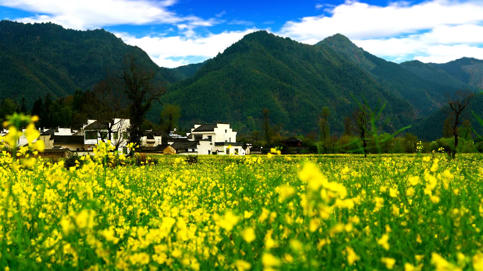 油菜花村落人家远山背景