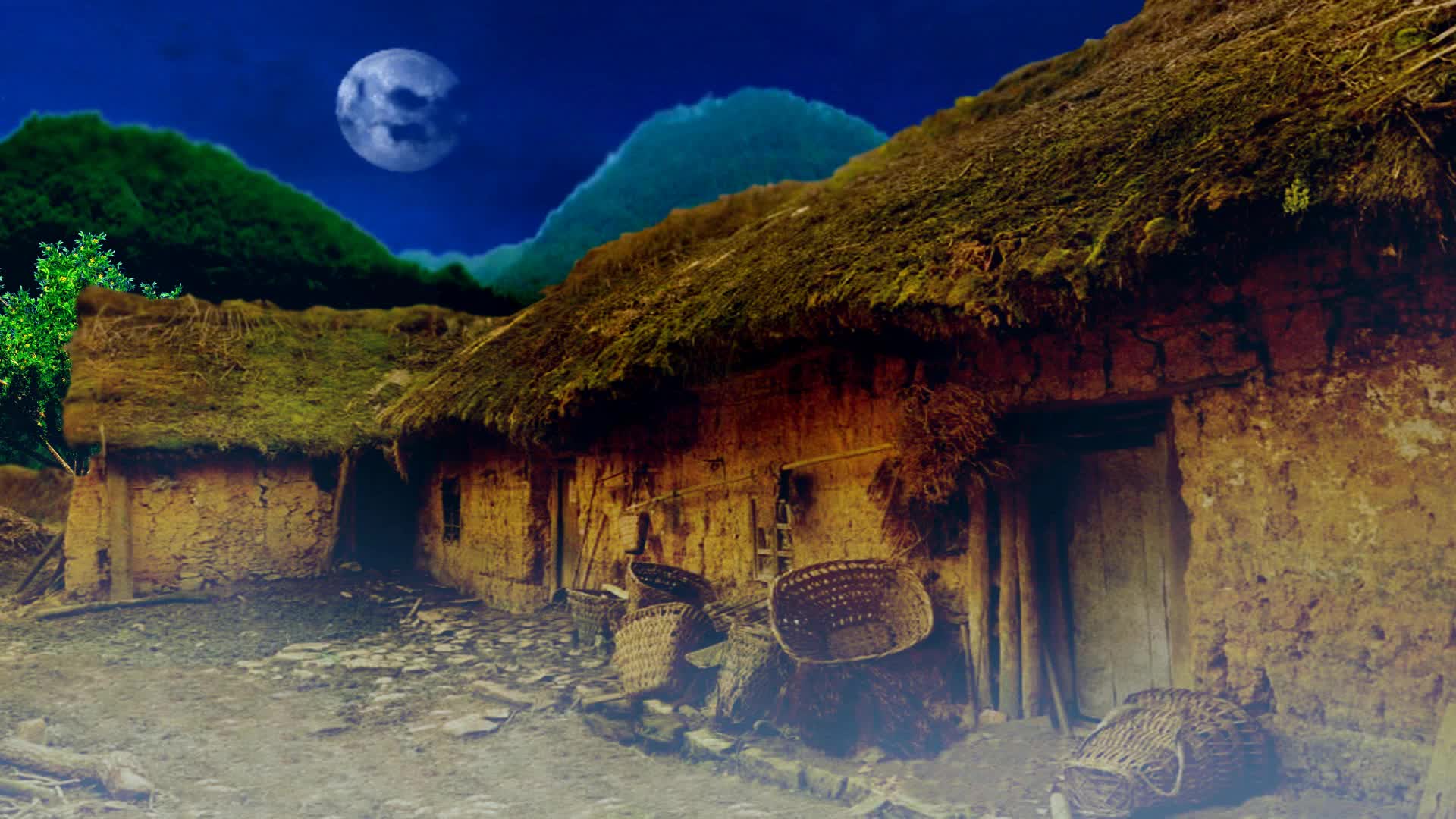 旧社会农村草房场景-夜晚