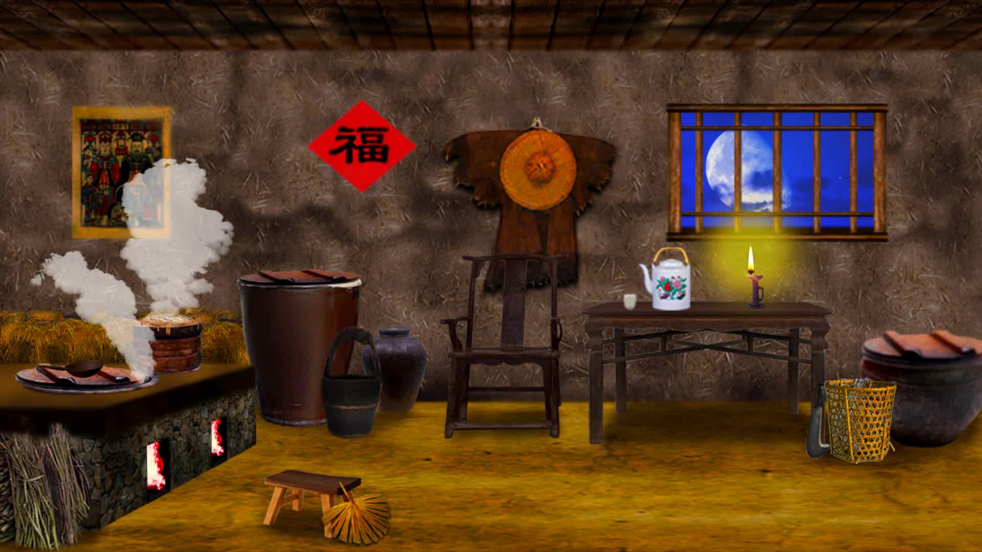 作品:古代厨房灶台舞台背景-晚上夜景
