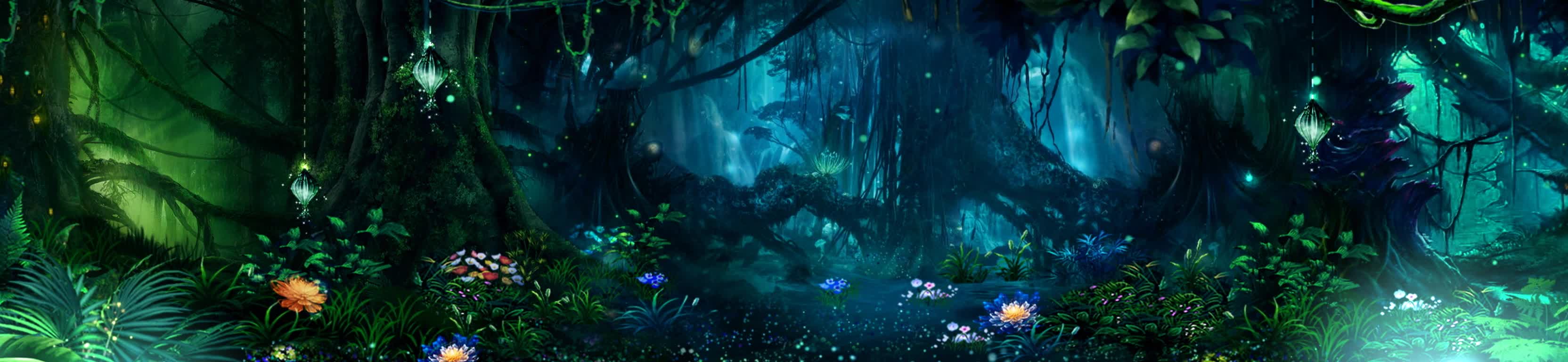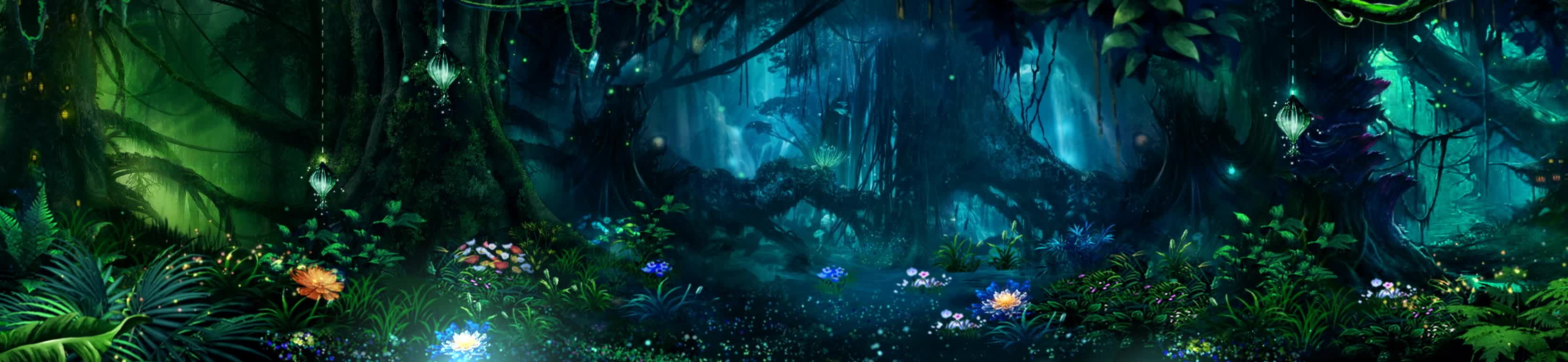 森林 树木 丛林 花 瀑布 山 粒子 光芒 河流 荧光 奇幻 神秘 风景 宴会厅 全息投影素材