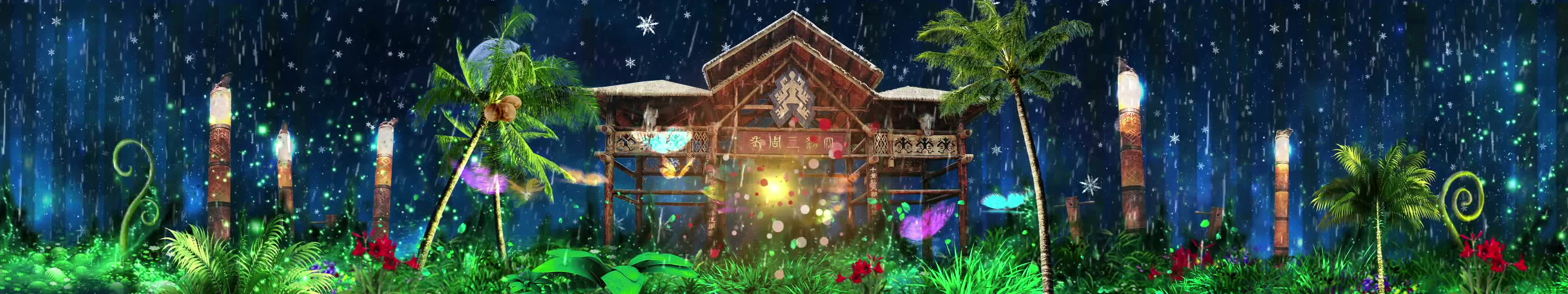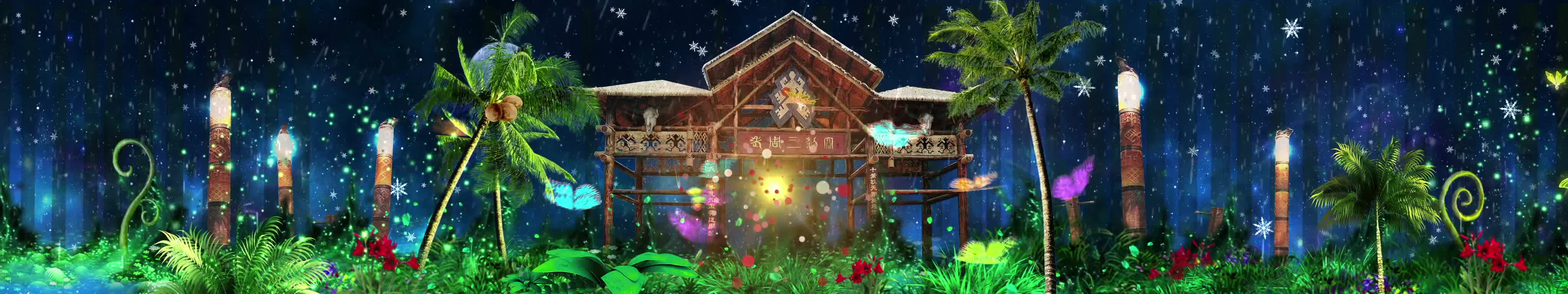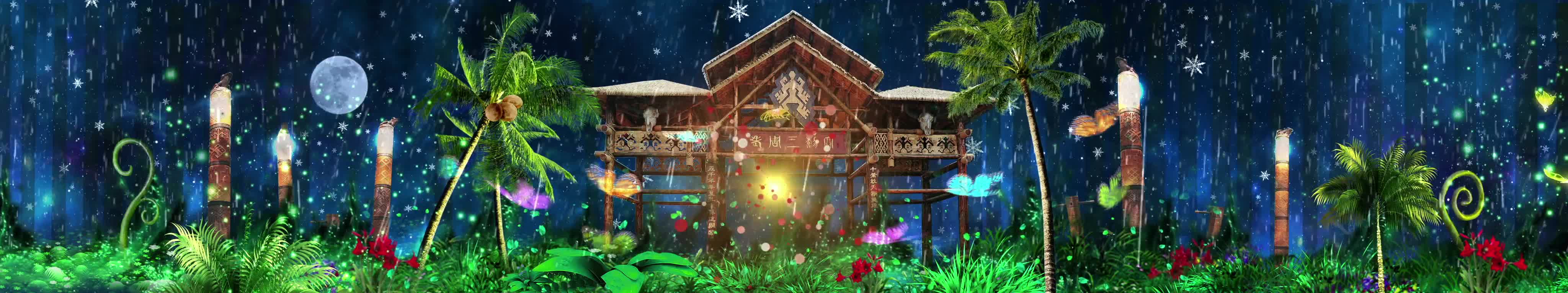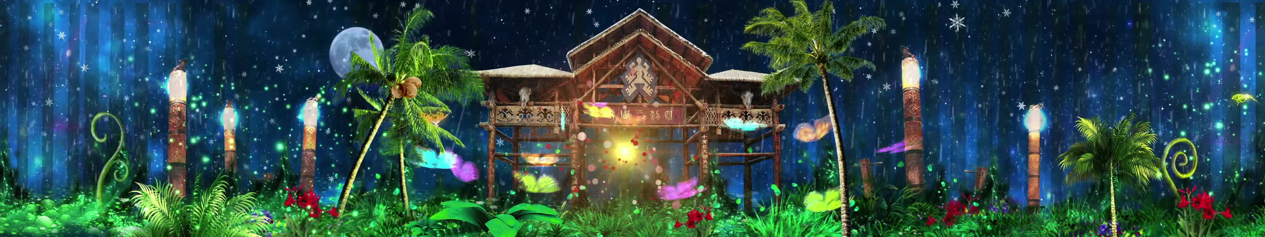 森林 丛林 椰子树 花朵 蝴蝶 鸟 房屋 夜景 大自然 清新 风景 宴会厅 全息投影素材