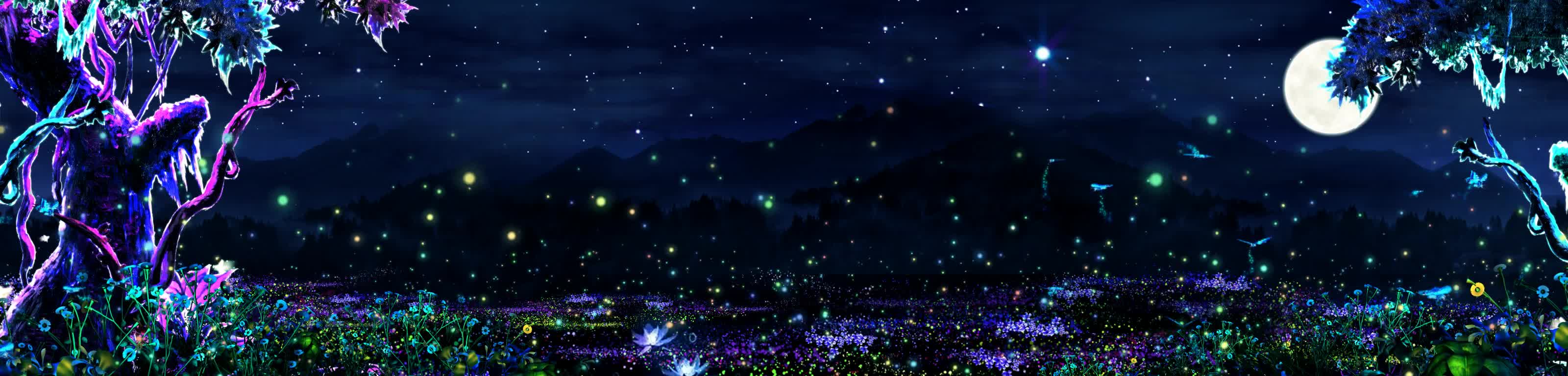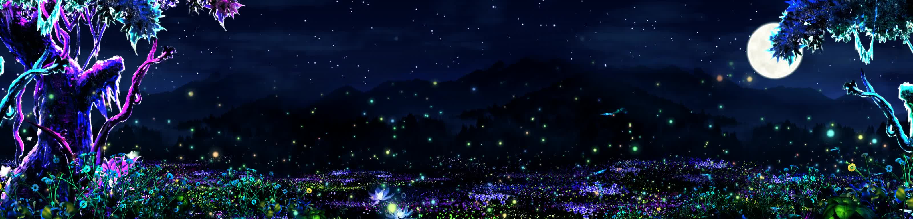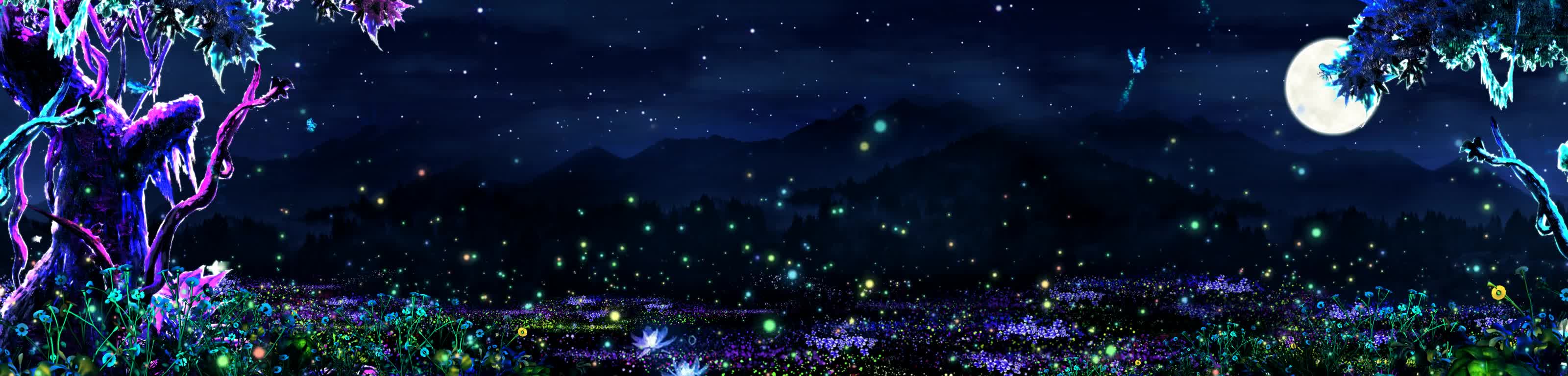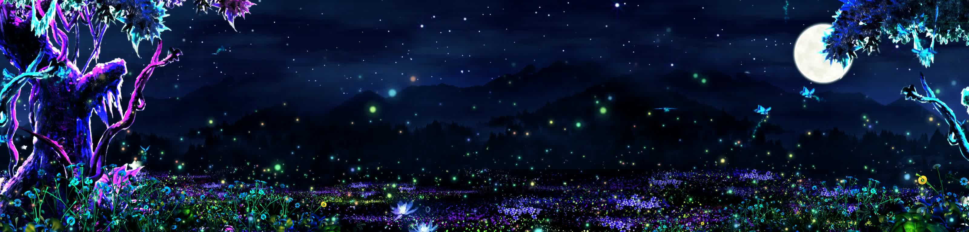 森林 花 草丛 蝴蝶 月亮 树 荧光 夜光 夜景 蓝色 神秘 梦幻 景区 风景 宴会厅 全息投影素材