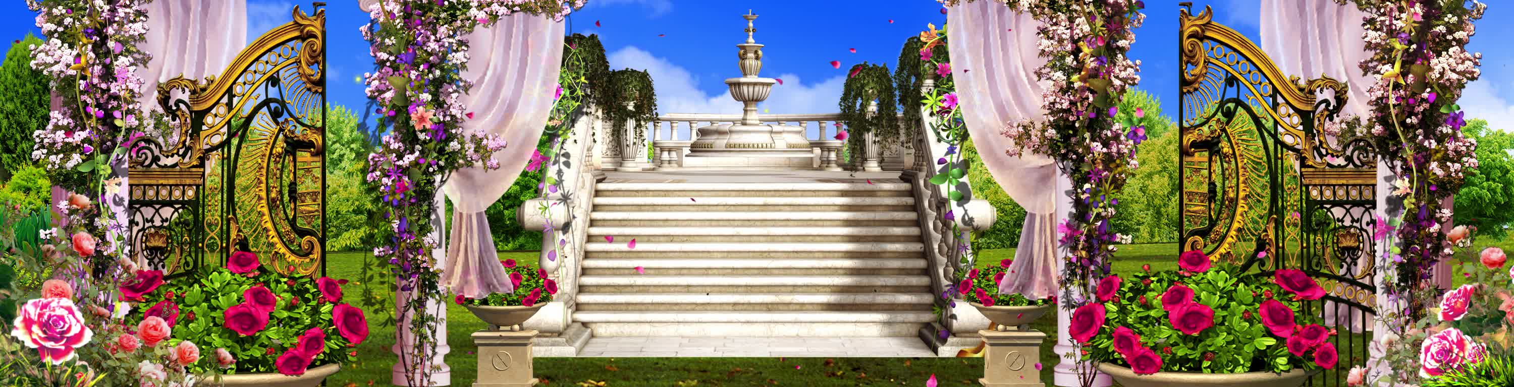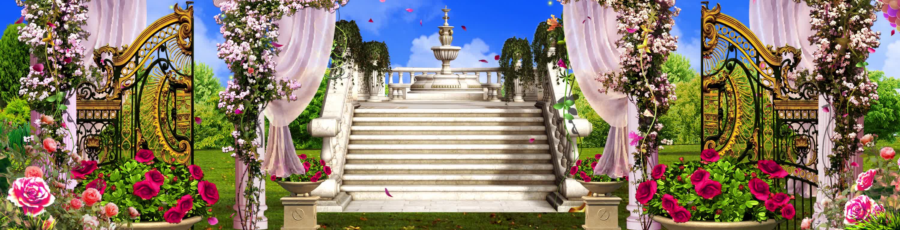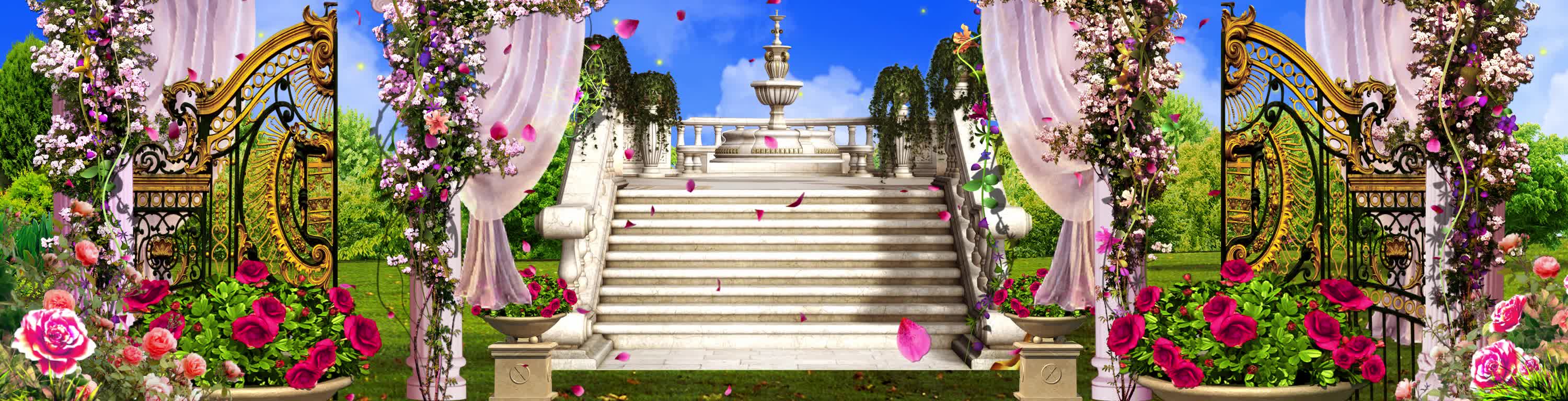 欧式 城堡 后花园 鲜花 花瓣 柱子 城堡后花园 蓝天白云 红色花瓣 欧式建筑 欧式风格 梦幻 浪漫 婚礼 宴会厅 风景 全息投影素材