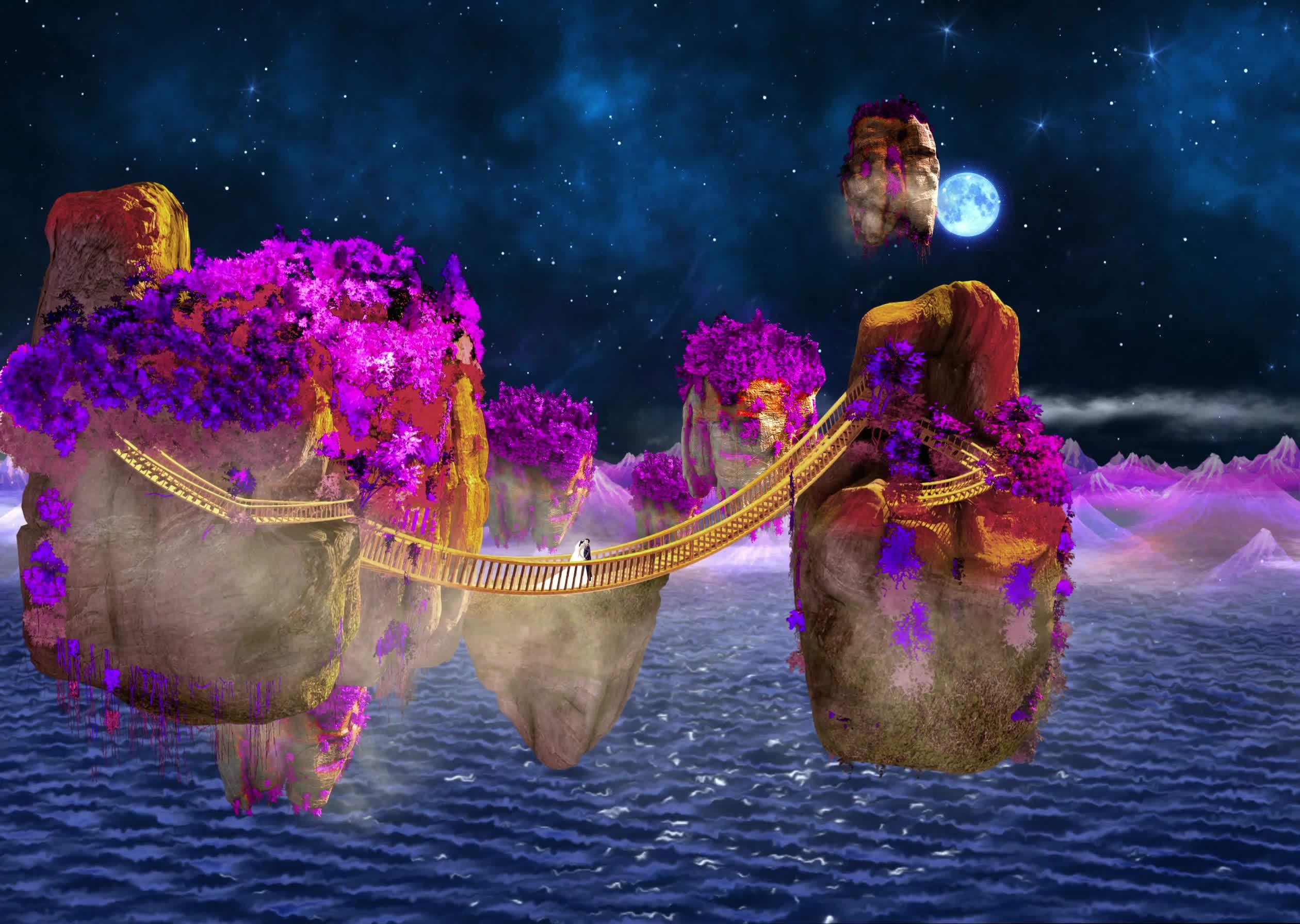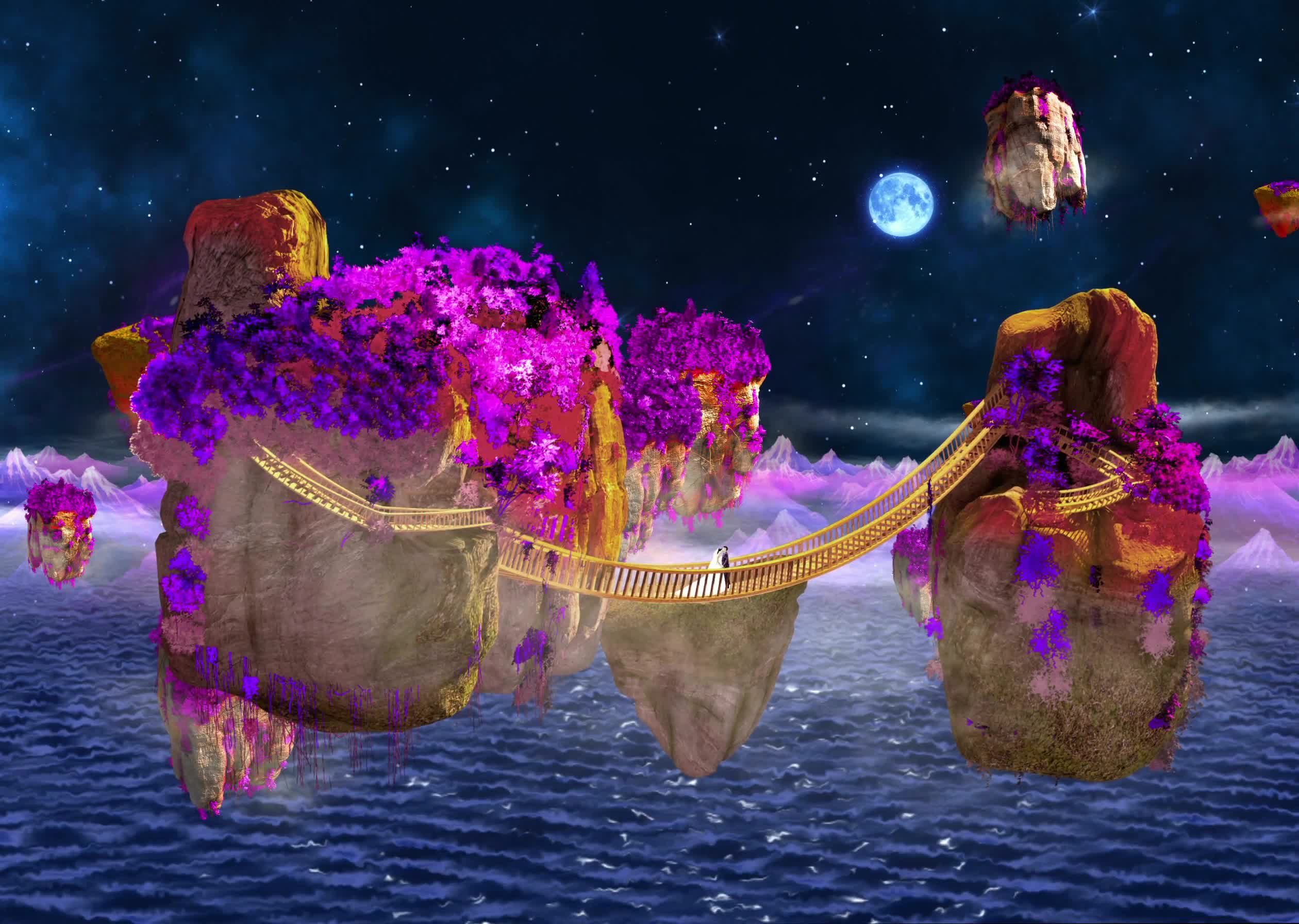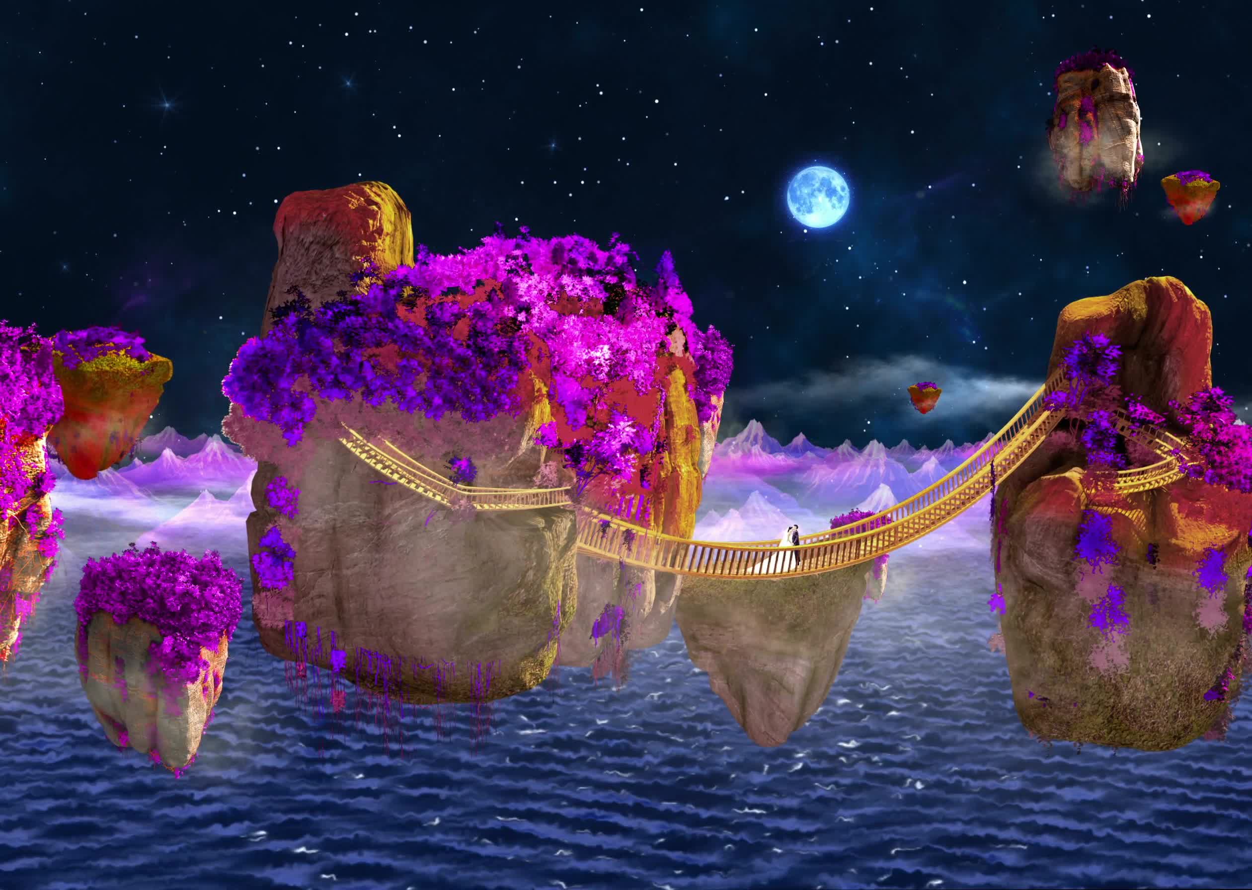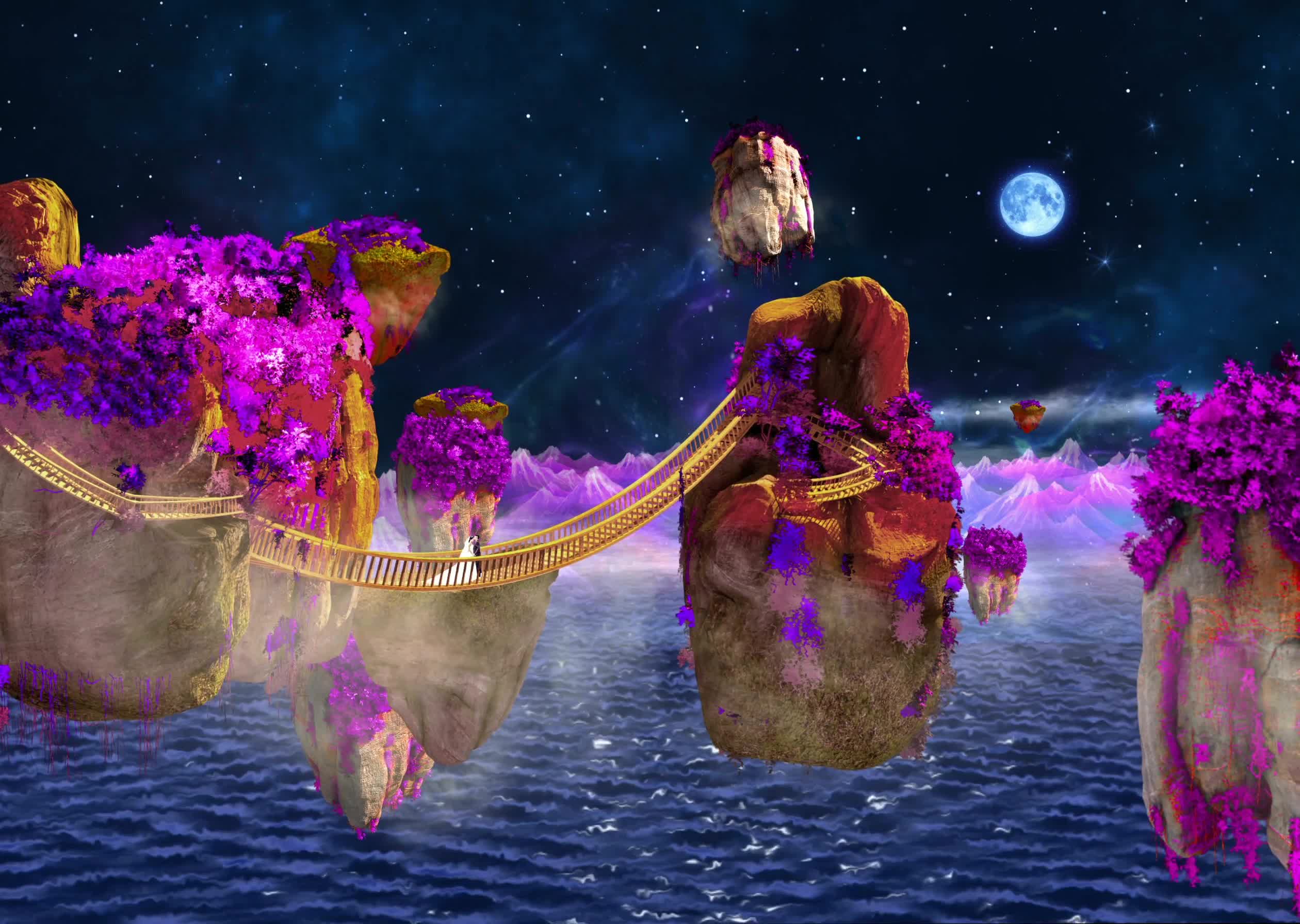 星云 浮山 空中浮山 天空 云层 宴会厅 舞美 浪漫婚礼 梦幻 梦幻云层 梦幻婚礼 梦幻星空 全息投影素材 阿凡达 新郎 新娘 月亮 唯美 浪漫 星星 湖水 蓝色 紫色 吊桥 漂浮 石头山 石头 紫花 紫树