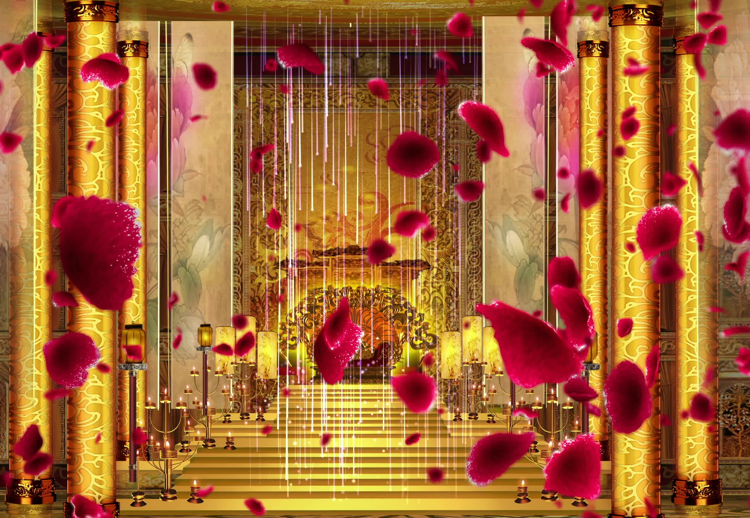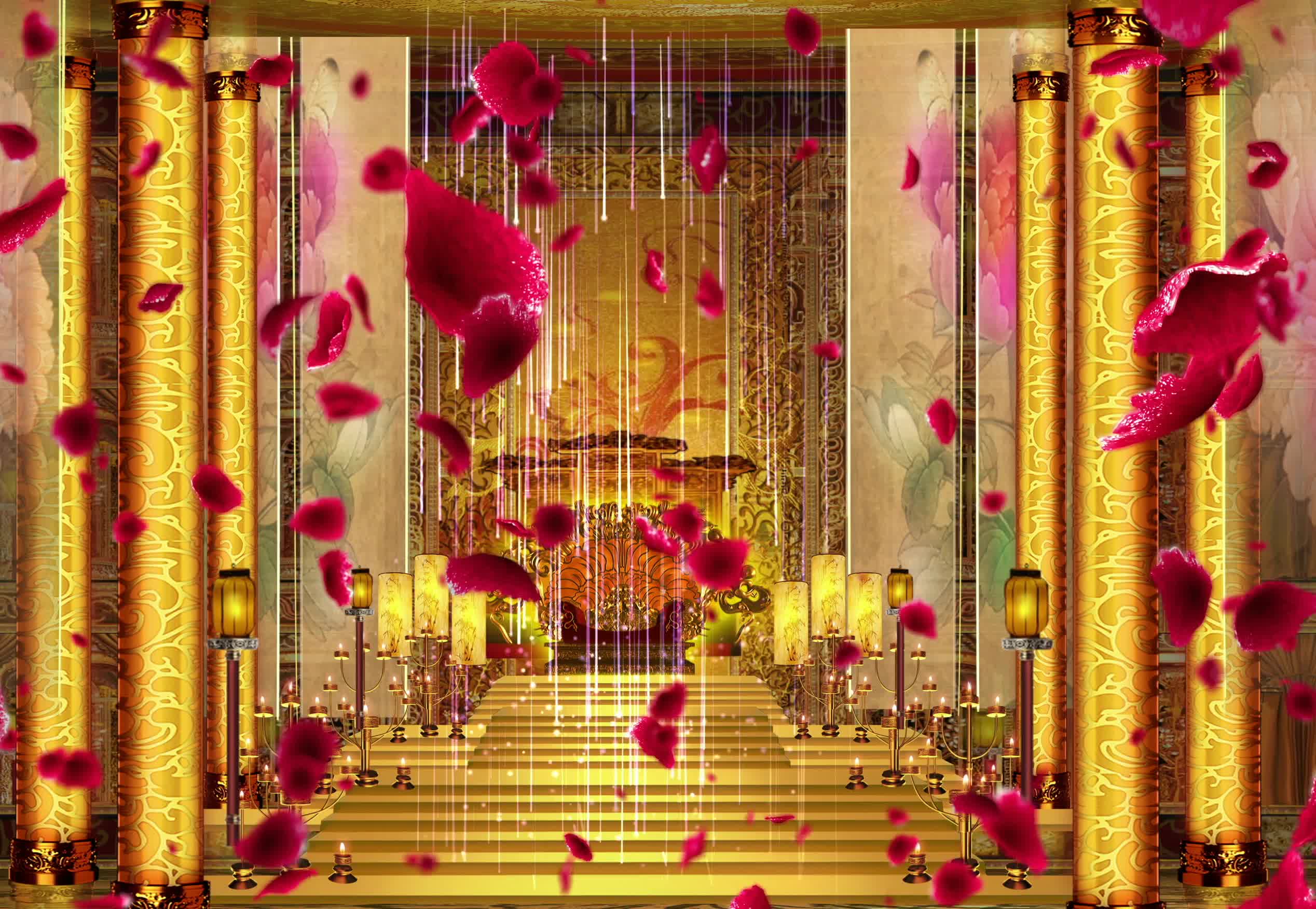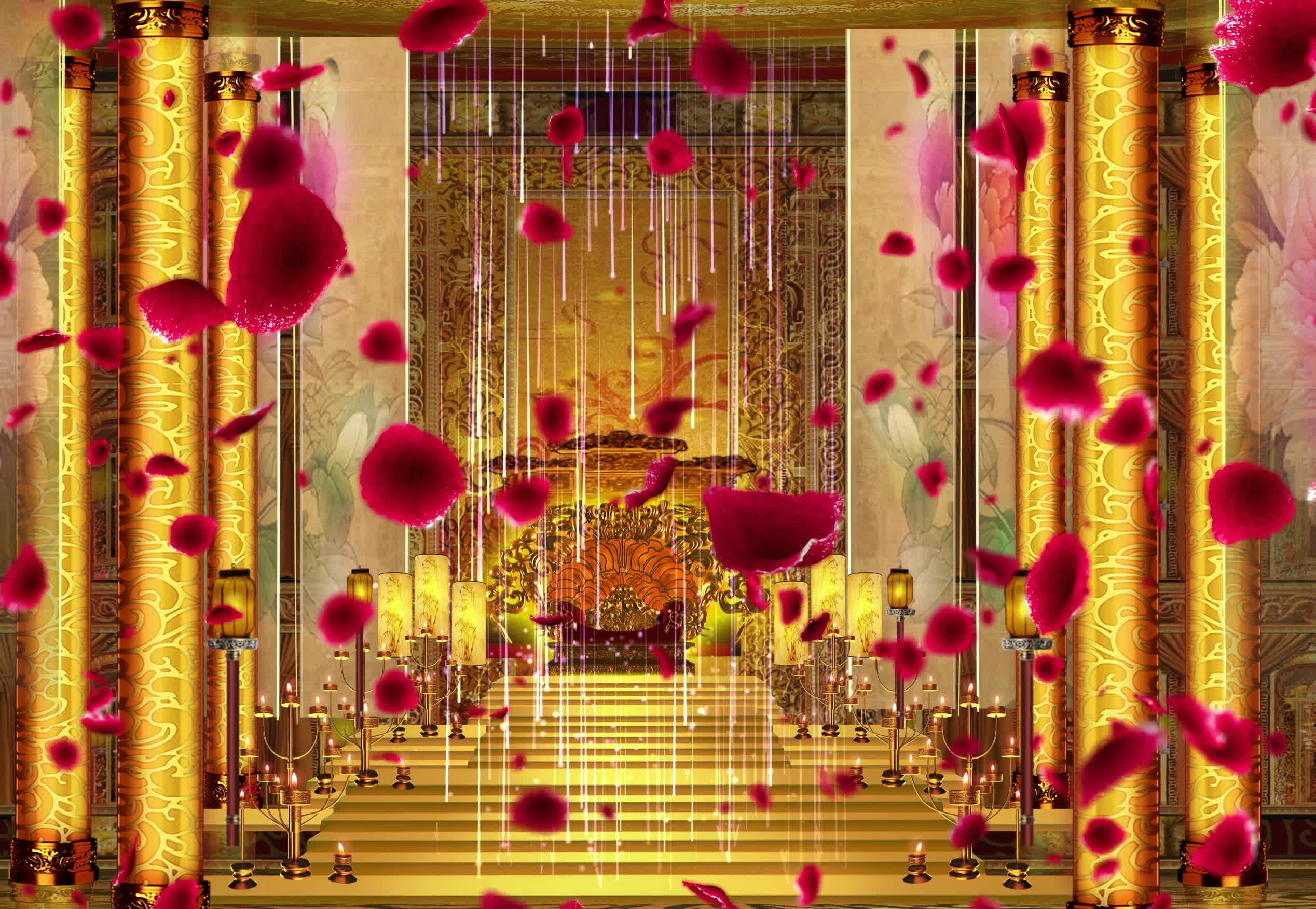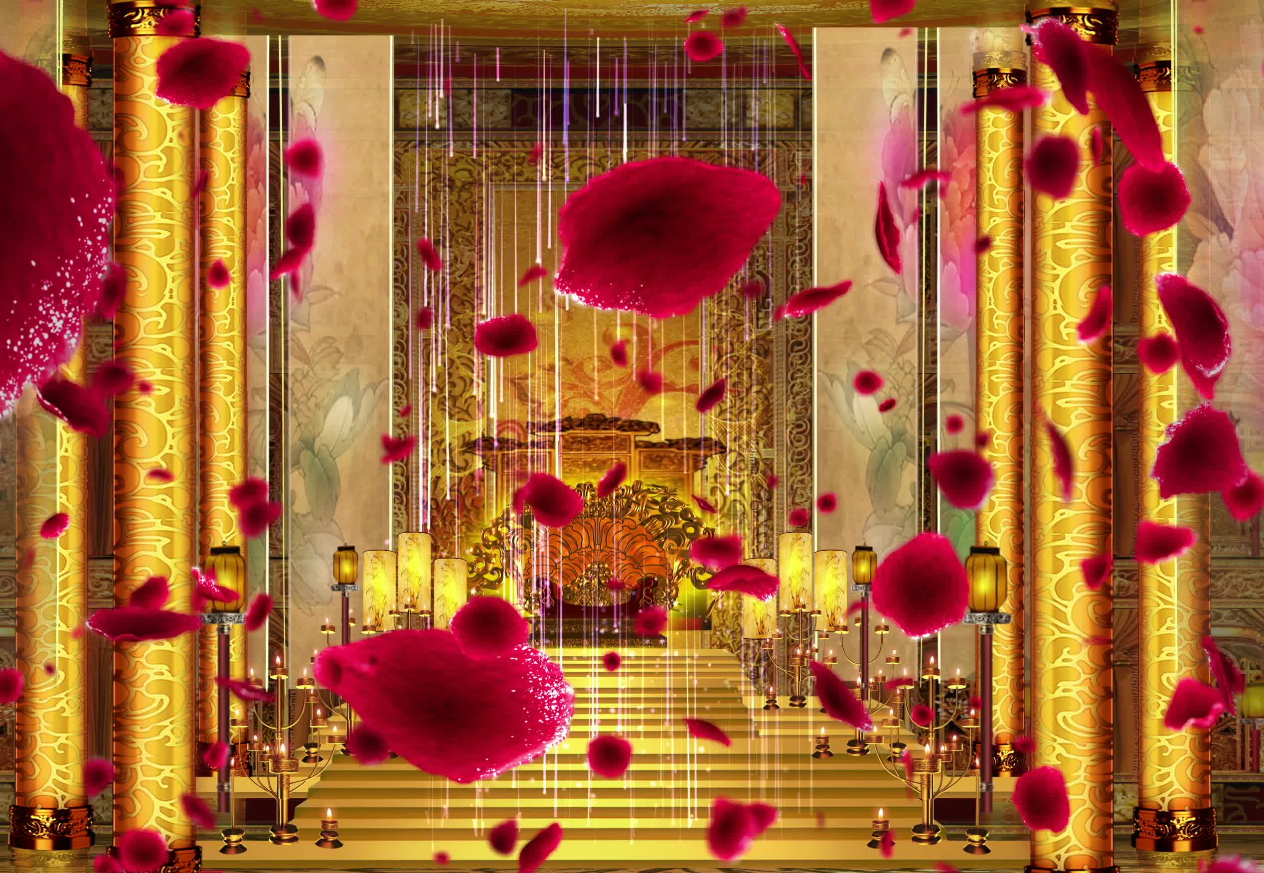 中式 皇宫 宫殿 花瓣 鲜花 雕花 立柱 柱子龙椅子 灯 长明灯 灯笼 红色花瓣 富贵 黄金屋 金色宫殿 中式婚礼 宴会厅 全息投影素材