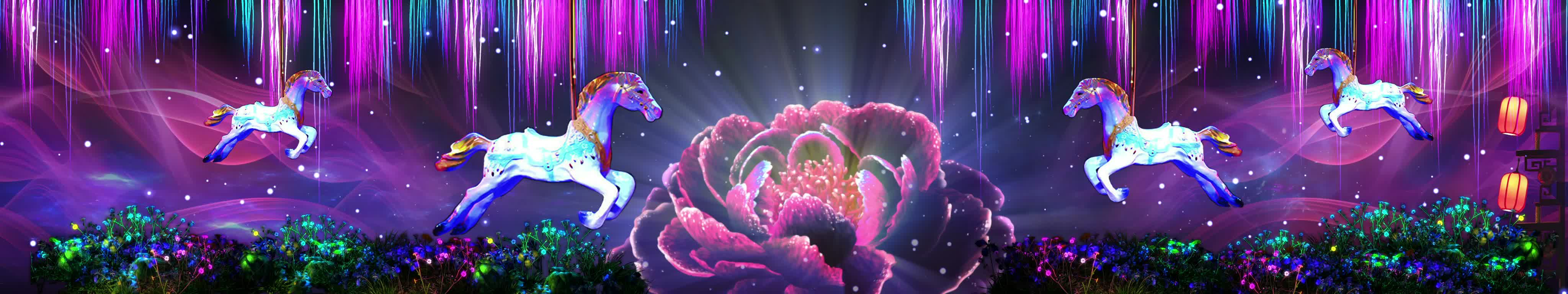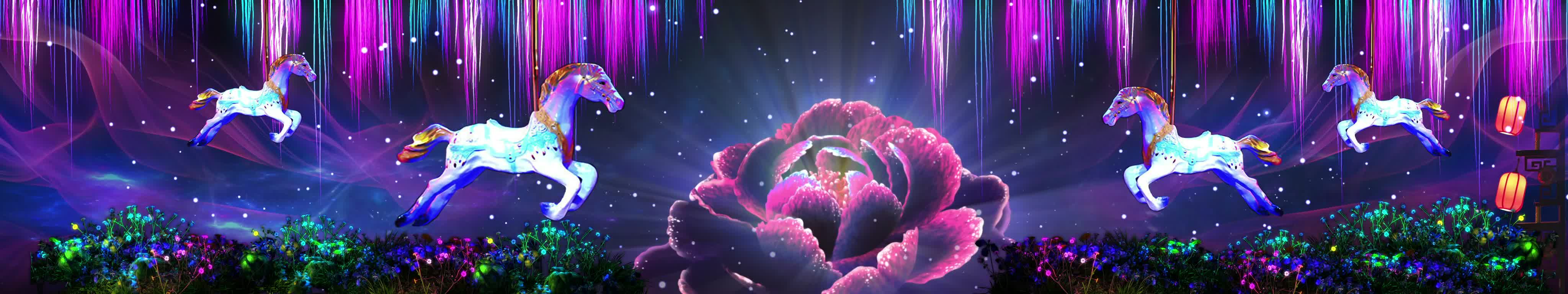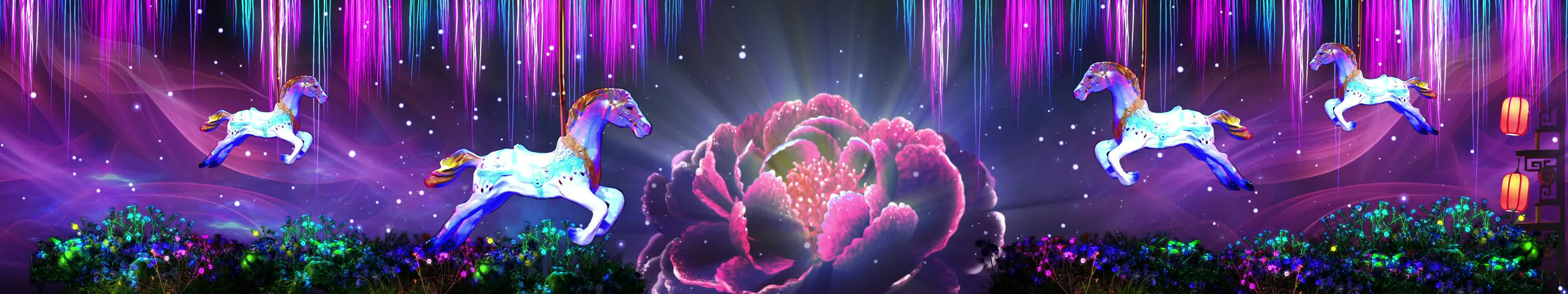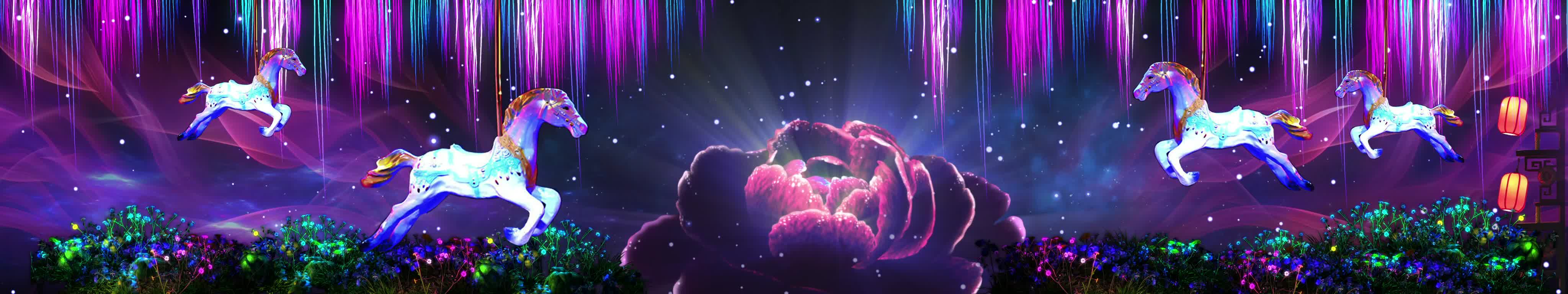 童真 鲜花 玫瑰花 开花 红色 马 木马 白色马 花丛 流光 星光 紫色 梦幻 神秘 宴会厅 风景 全息投影素材