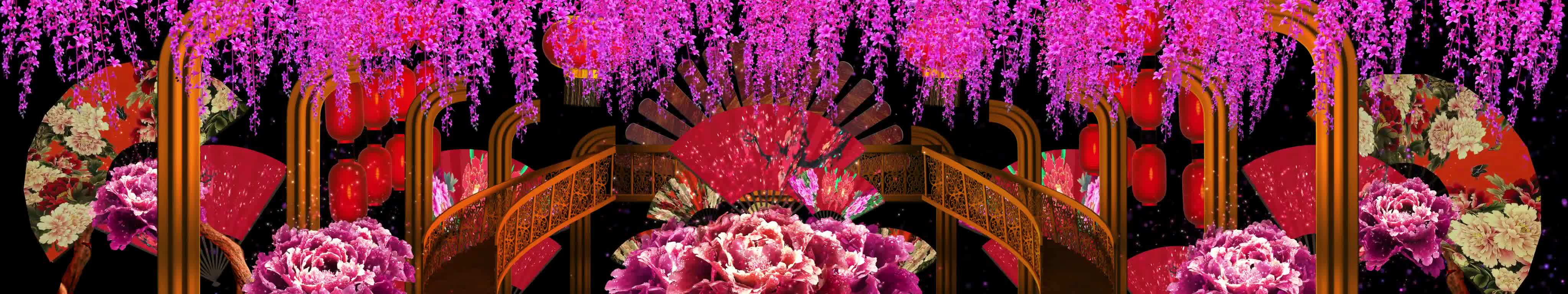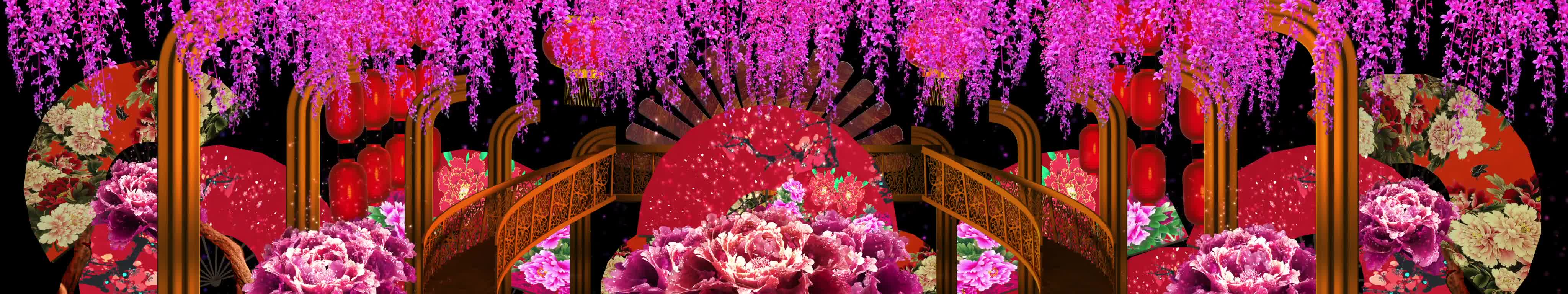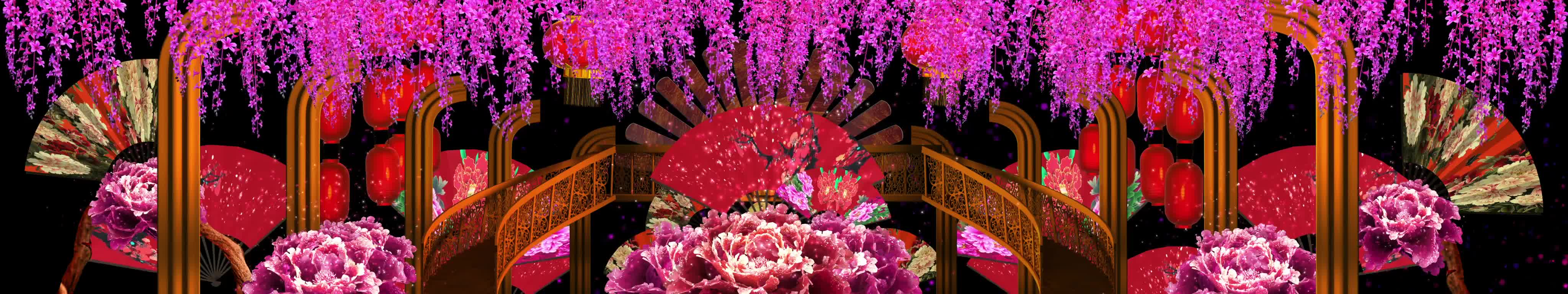 汉唐 红色古扇 中式宴会厅 浪漫婚礼 牡丹花扇 红灯笼 复古中国风 展厅 全息素材 全息投影素材视频