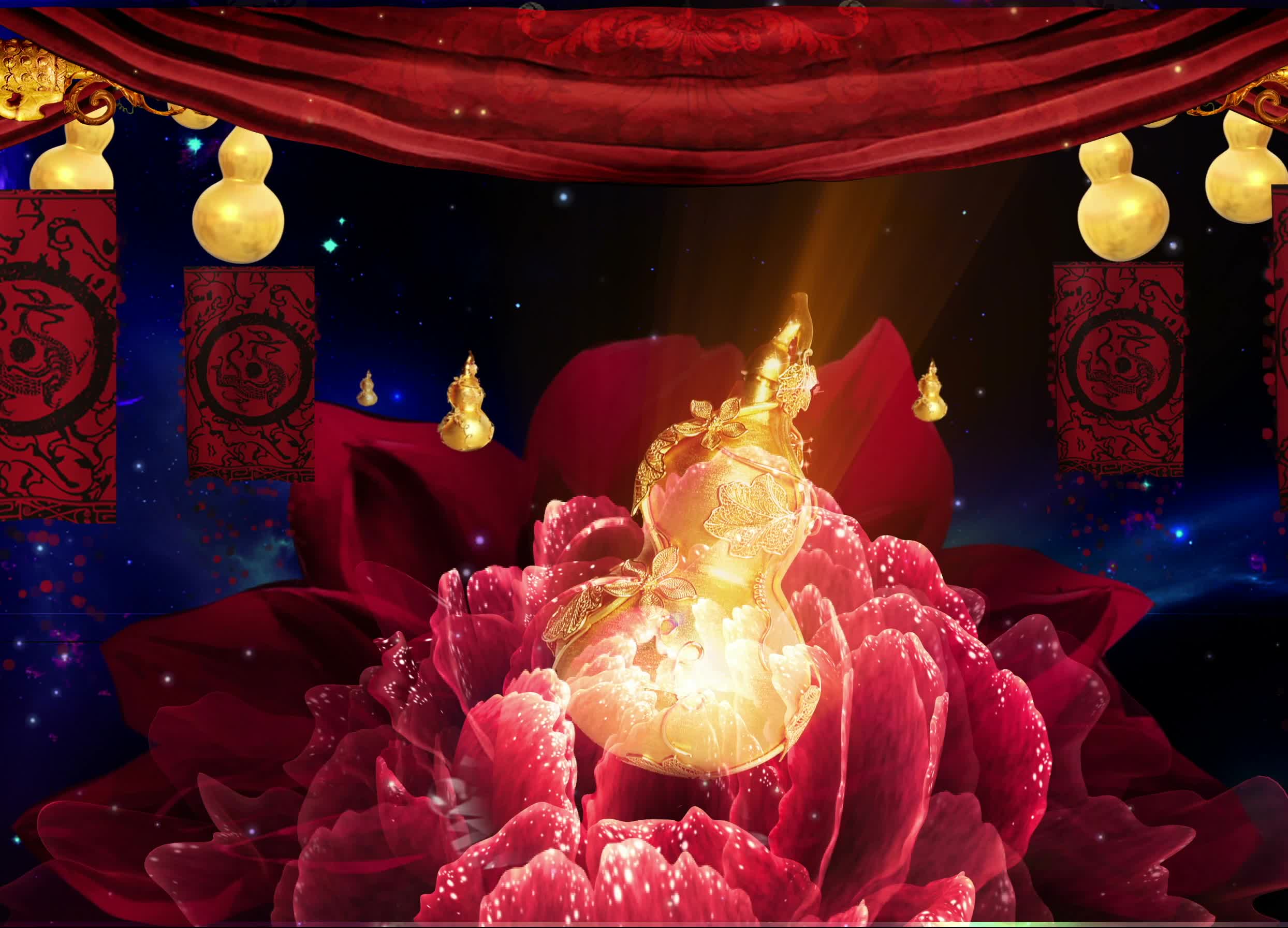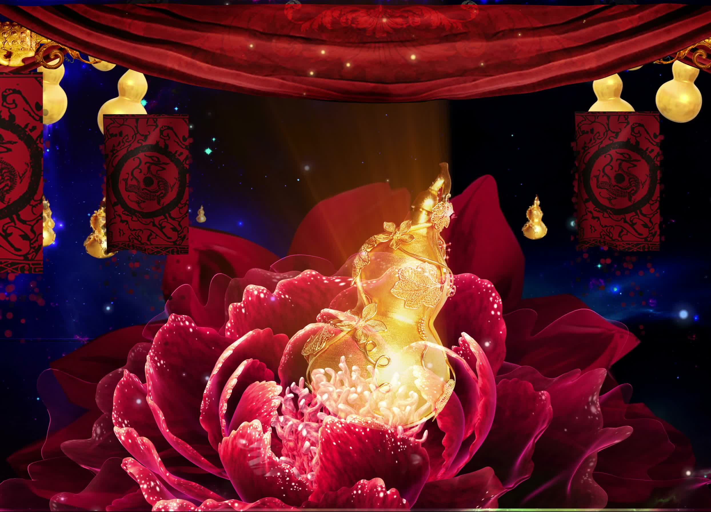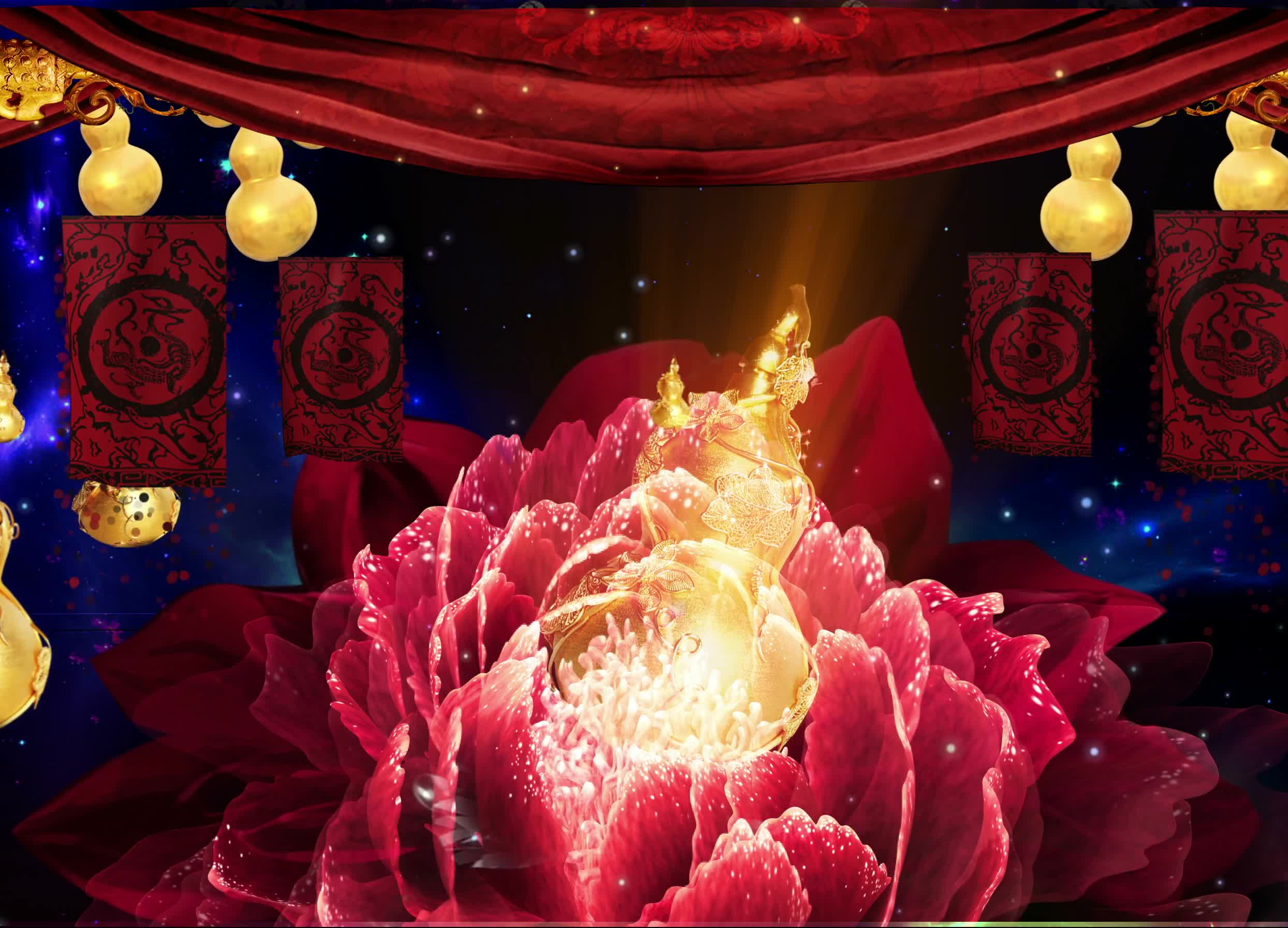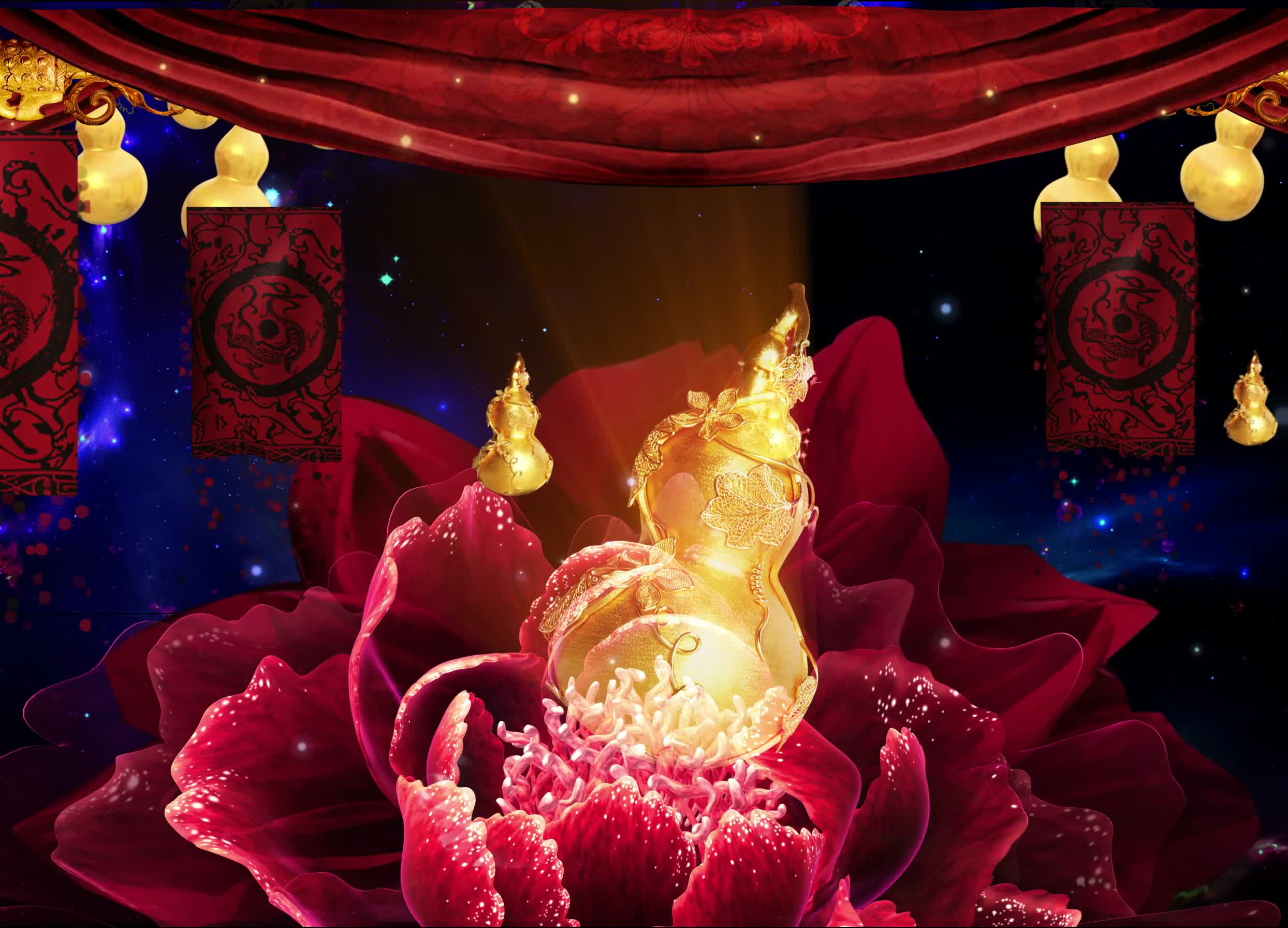 葫芦花瓣 中式宴会厅 浪漫婚礼 喜庆 复古中国风 红色鲜花开 帘子 全息素材 全息投影素材视频