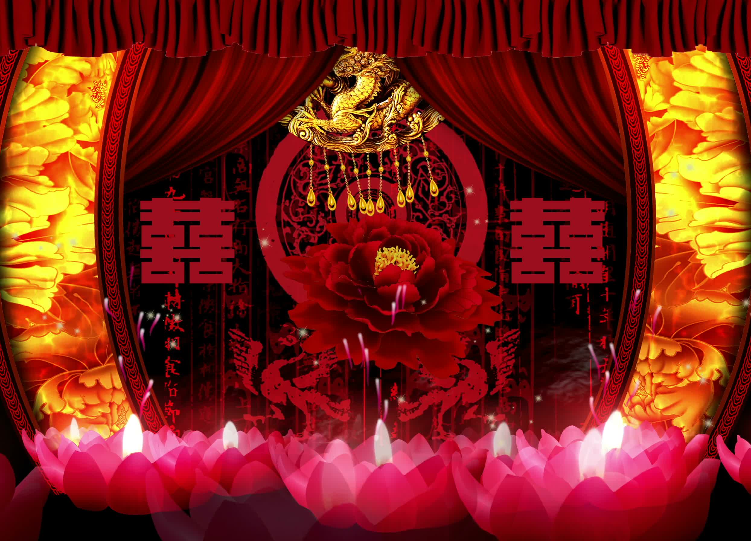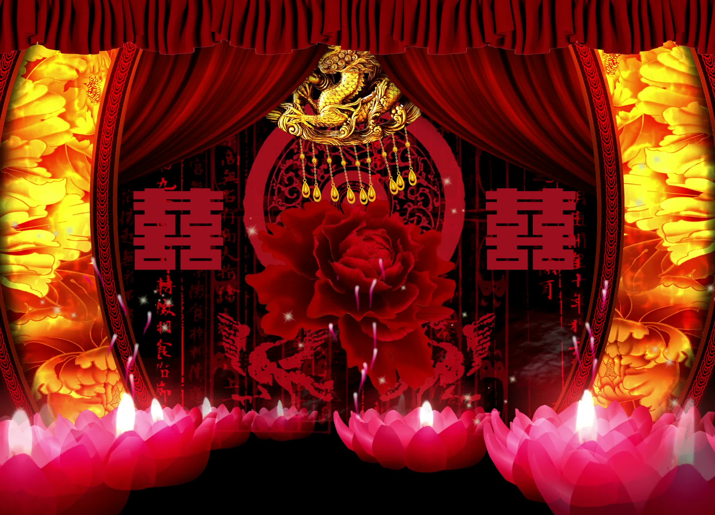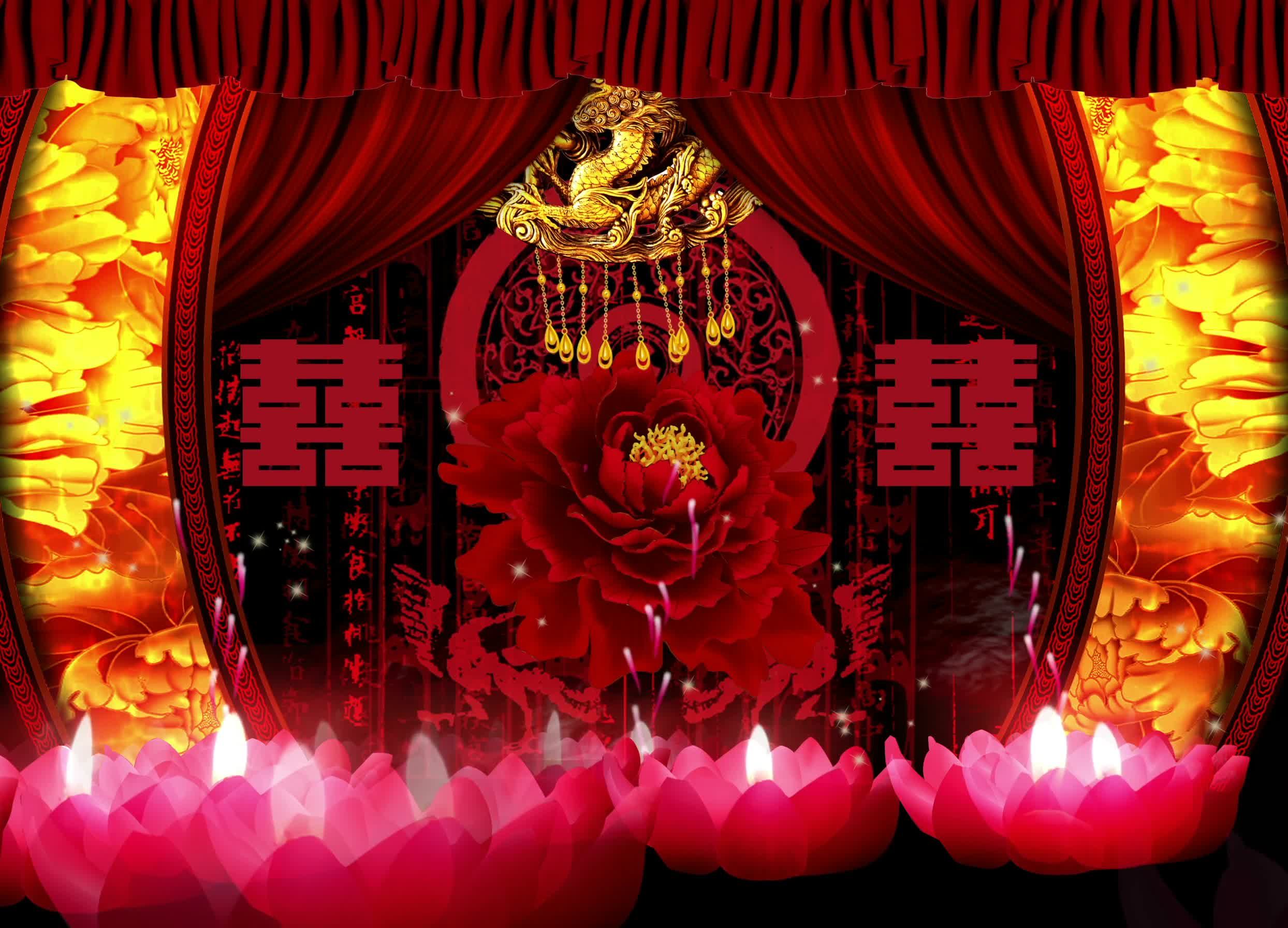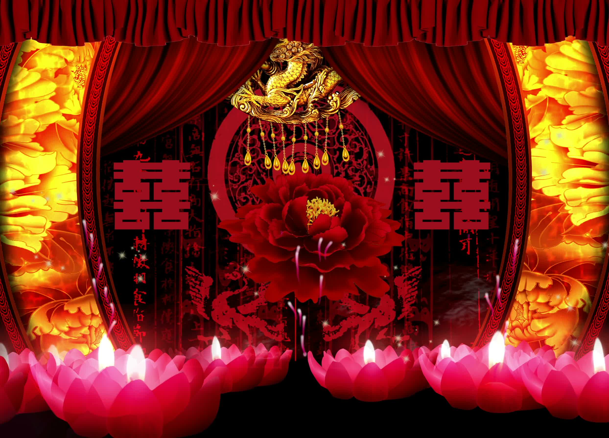 宴会厅 红色喜庆风格 中国风 古风婚礼 牡丹花 灯笼 莲花灯 全息素材 全息投影素材视频