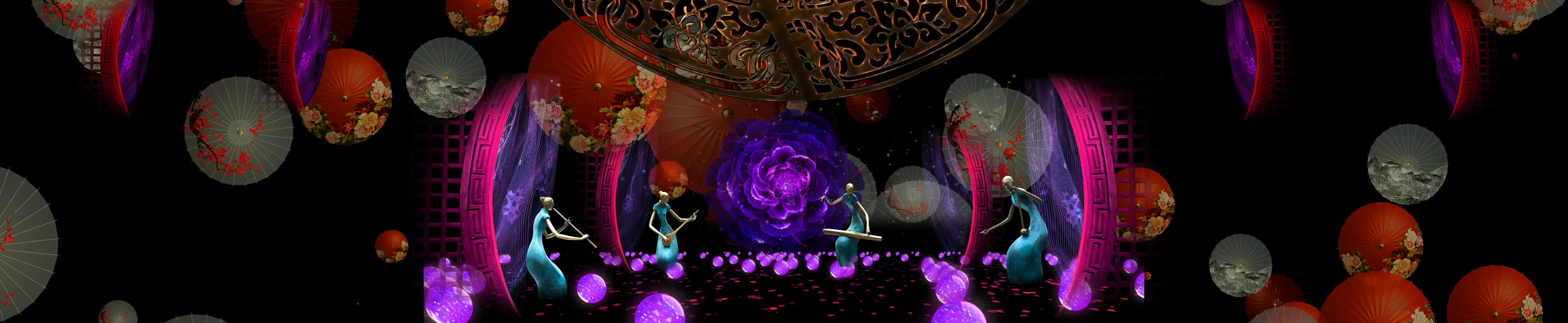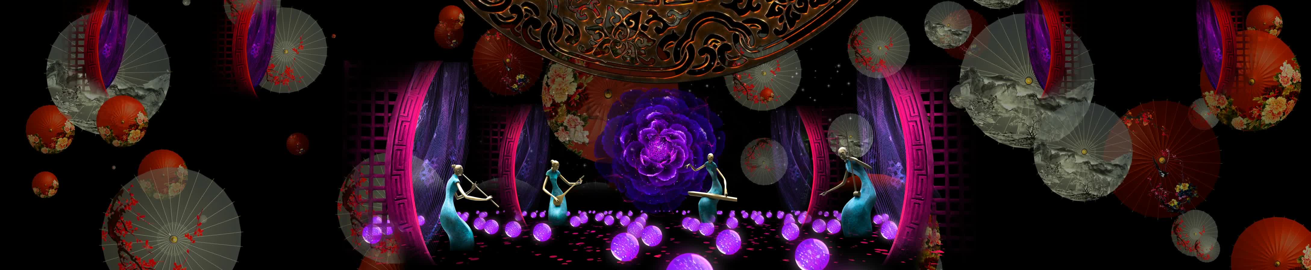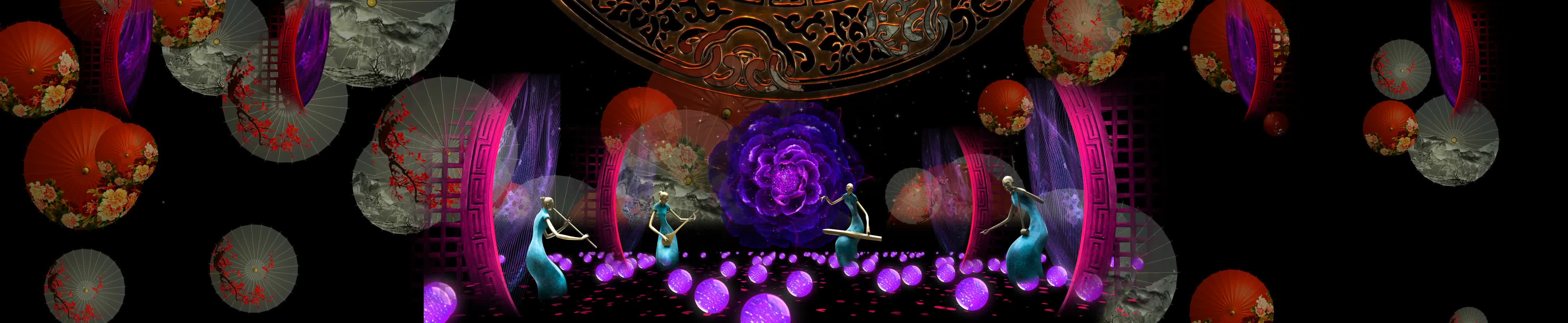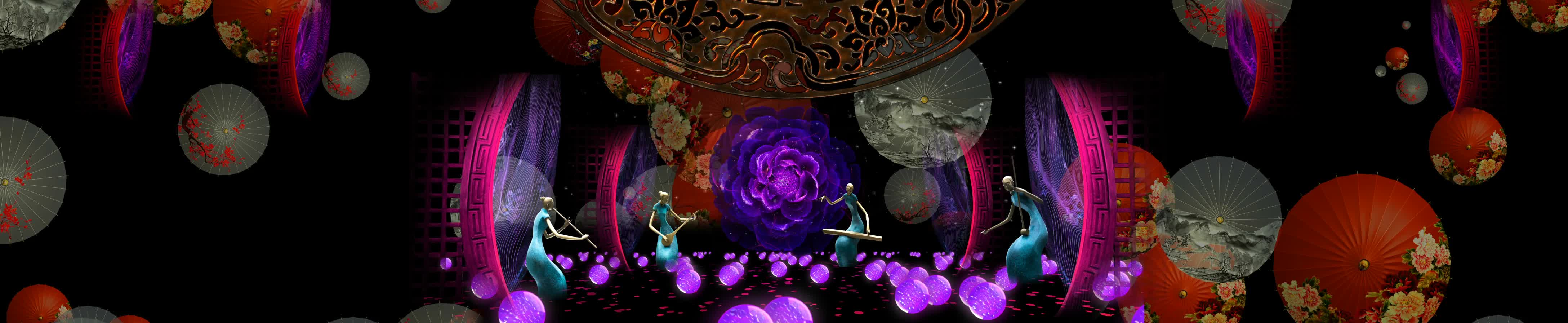旗袍走秀 宴会厅 中国风开场秀 中式古风 紫色鲜花 牡丹花 油纸伞 雕刻窗花 全息素材 全息投影素材视频
