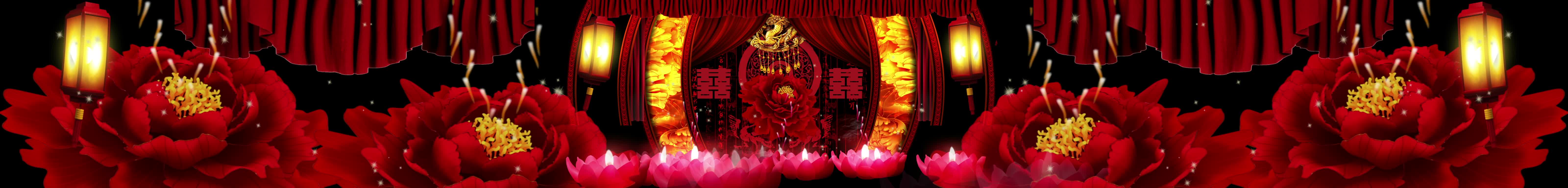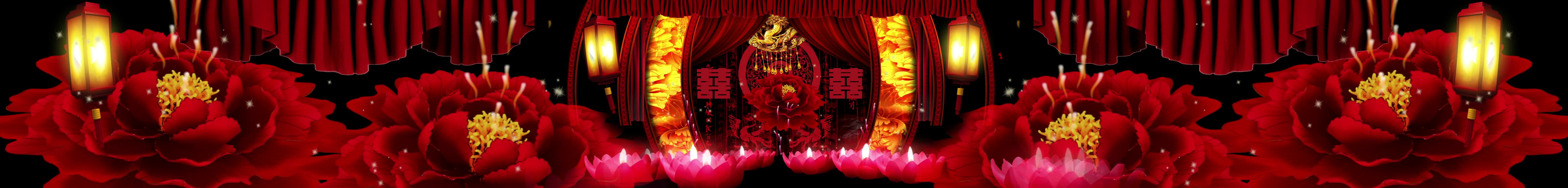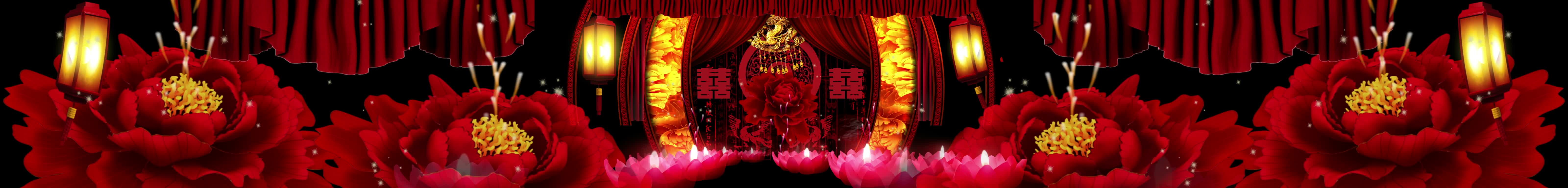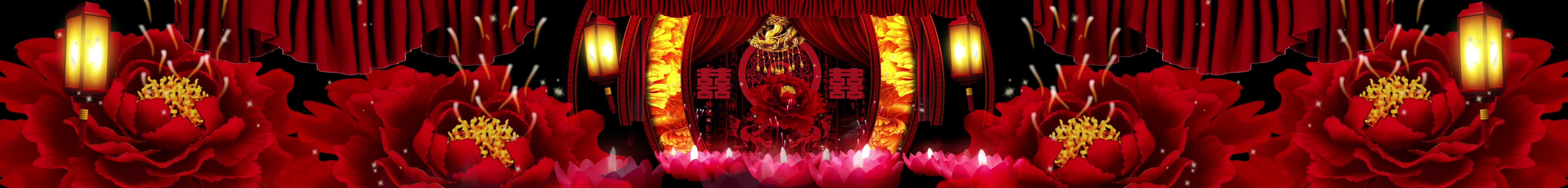 宴会厅 红色喜庆风格 中国风 古风婚礼 牡丹花 灯笼 莲花灯 全息素材 全息投影素材视频