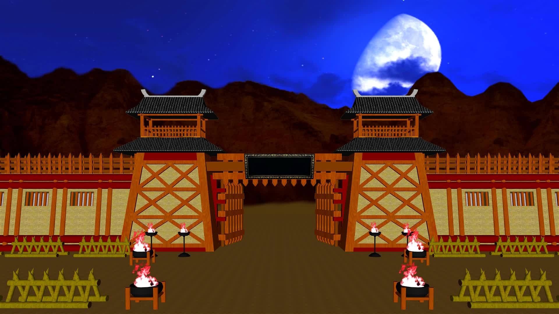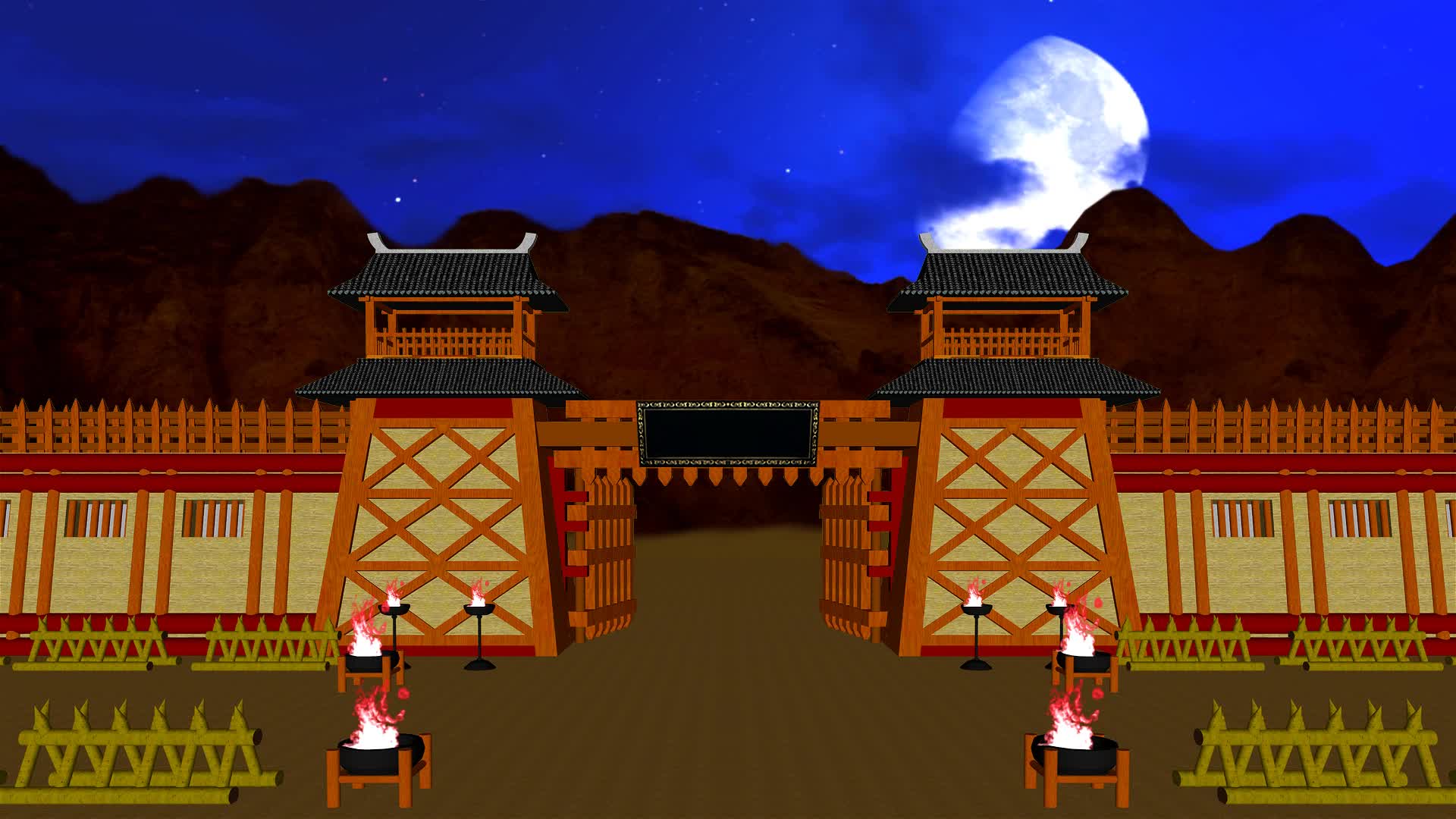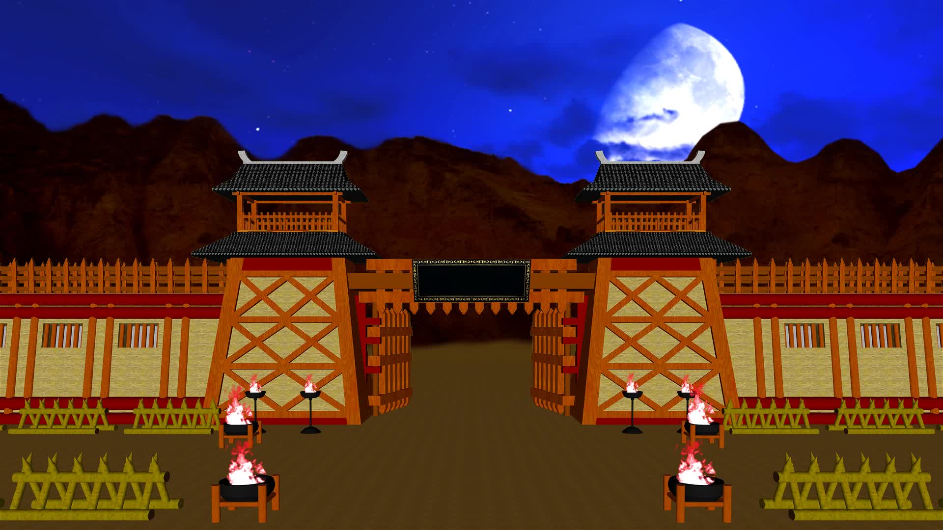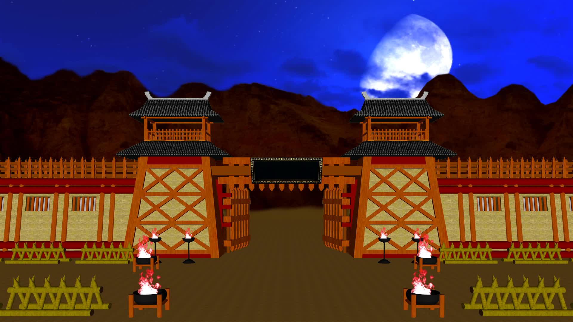 营房 战场 帅营 古代番营 辽营 阵地 安营扎寨 戏曲场景 战营 军营 营地 大帅营 古典山寨 营盘军营 三维动画 瞭望台 瞭望楼 城门 剧本杀 古装剧 小品情景剧 舞台剧 晚上 夜晚 夜色 月色 夜景