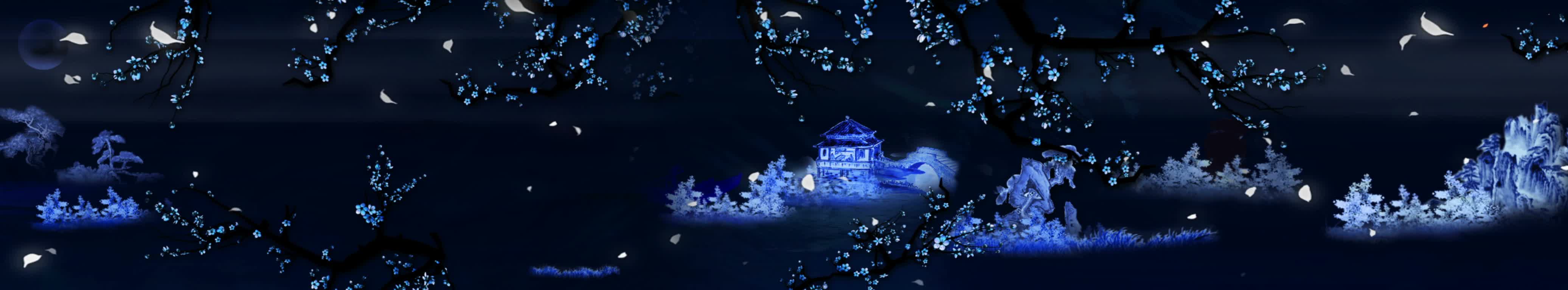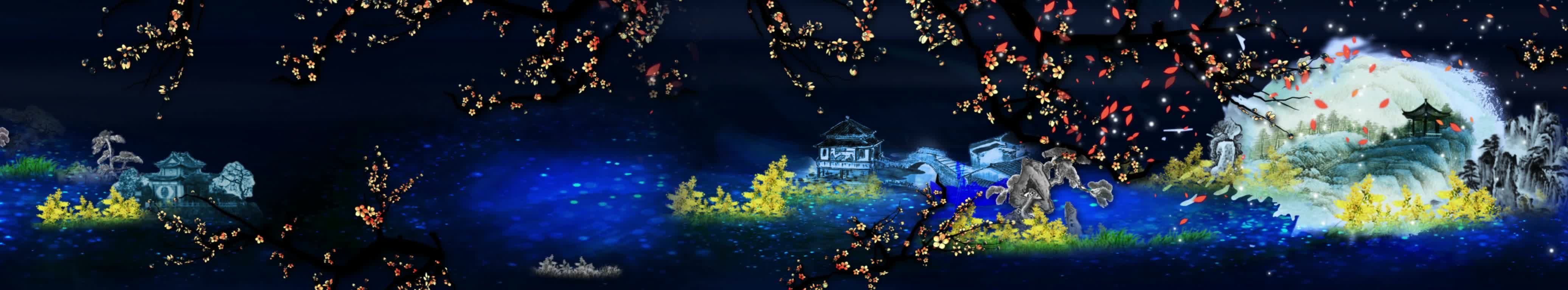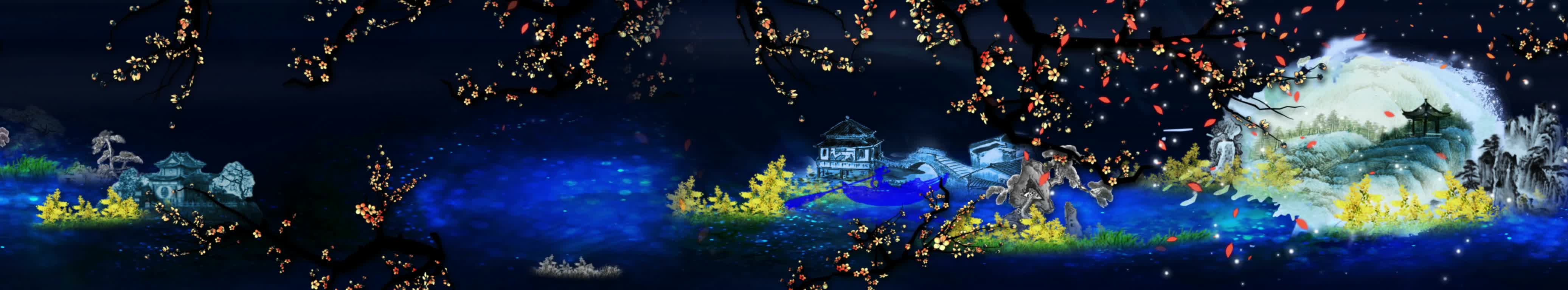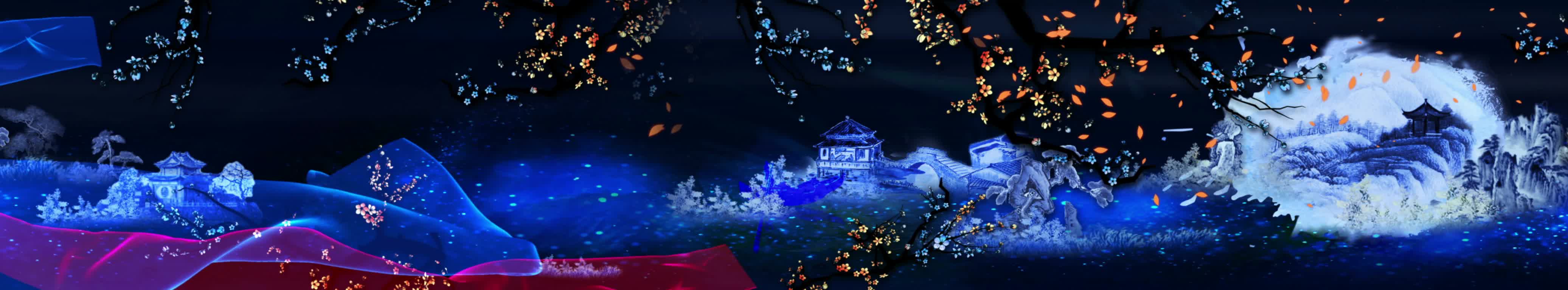全息餐厅,水墨画,花瓣,全息素材,3D餐厅,蓝色,裸眼3D投影,金色,粒子,全息素材视频,视频定制,素材定制,蓝色丝带,红色丝带,小溪,水流,花草,落叶,小船,船夫,亭子