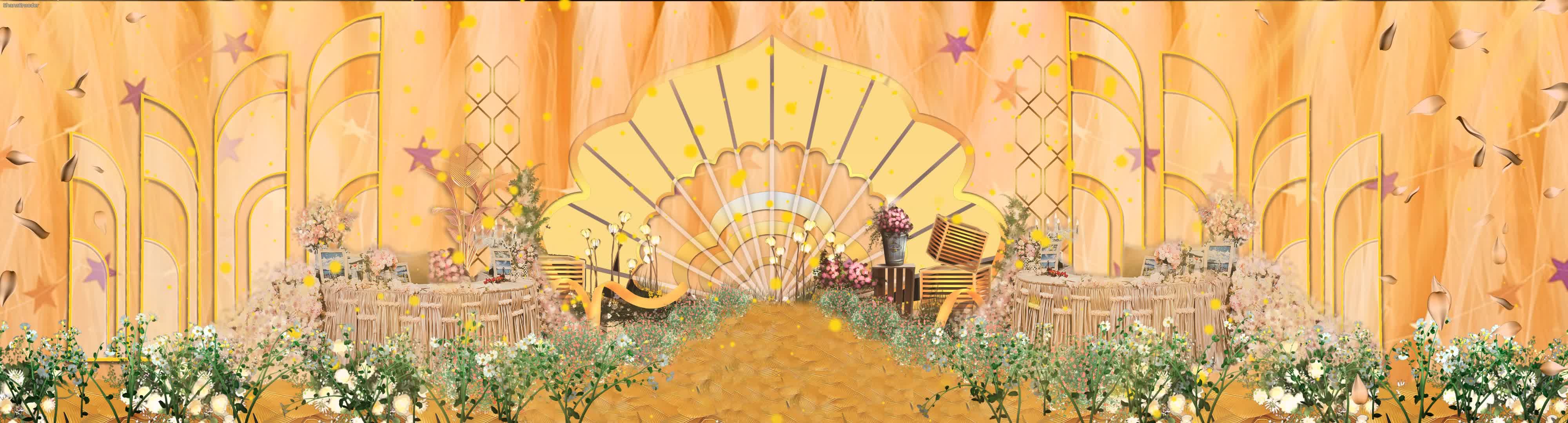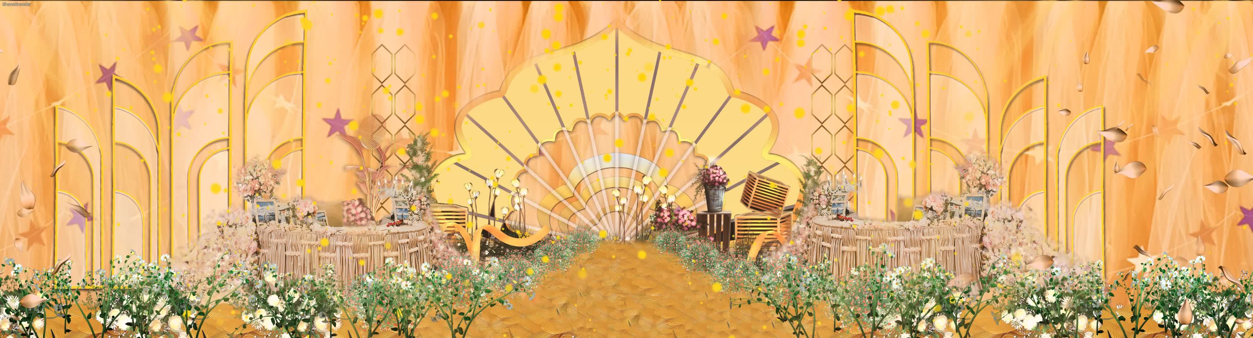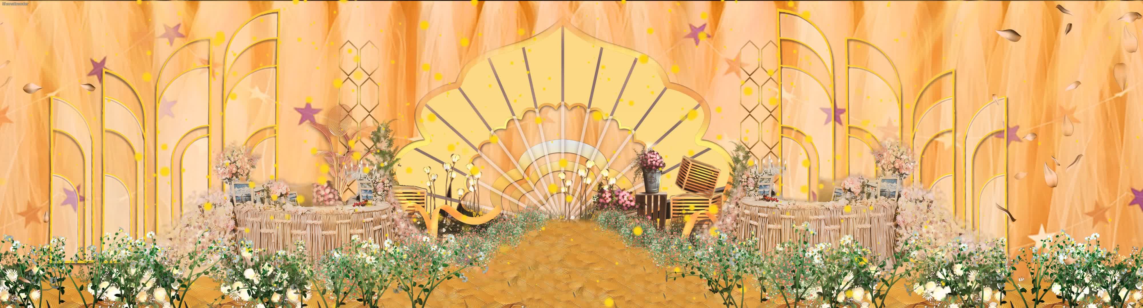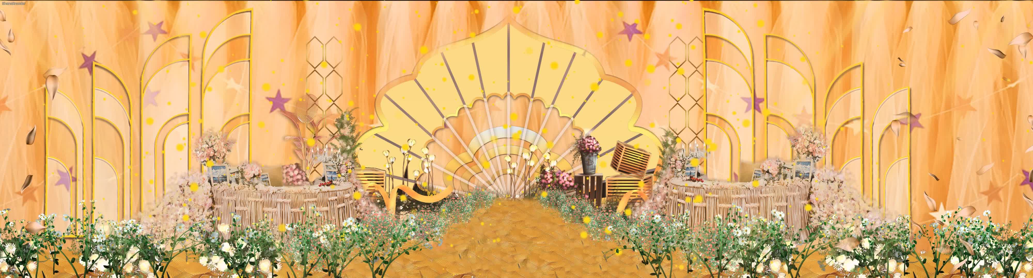 香槟色 欧式 鲜花 金色 粒子 绿植 绸缎 水晶 全息宴会厅 花园 花边飘落