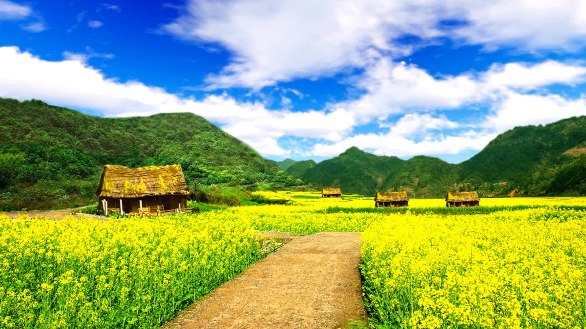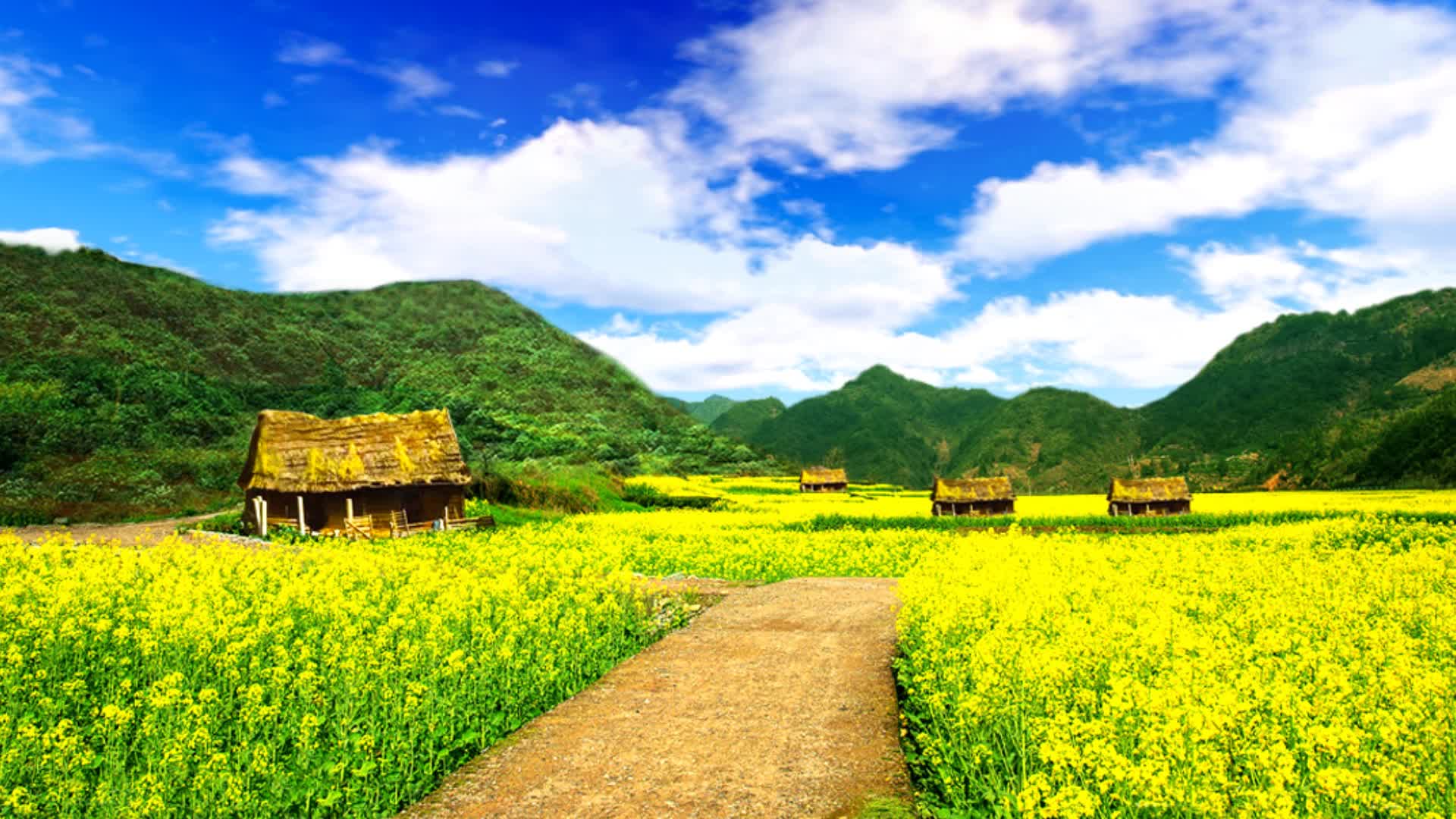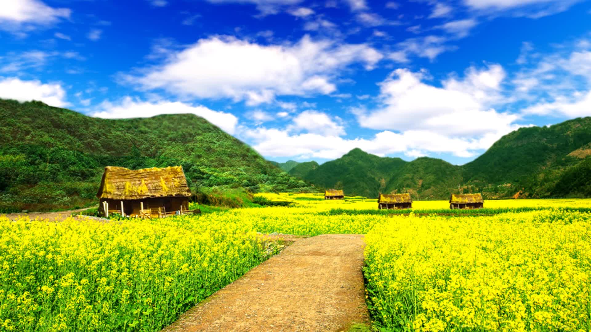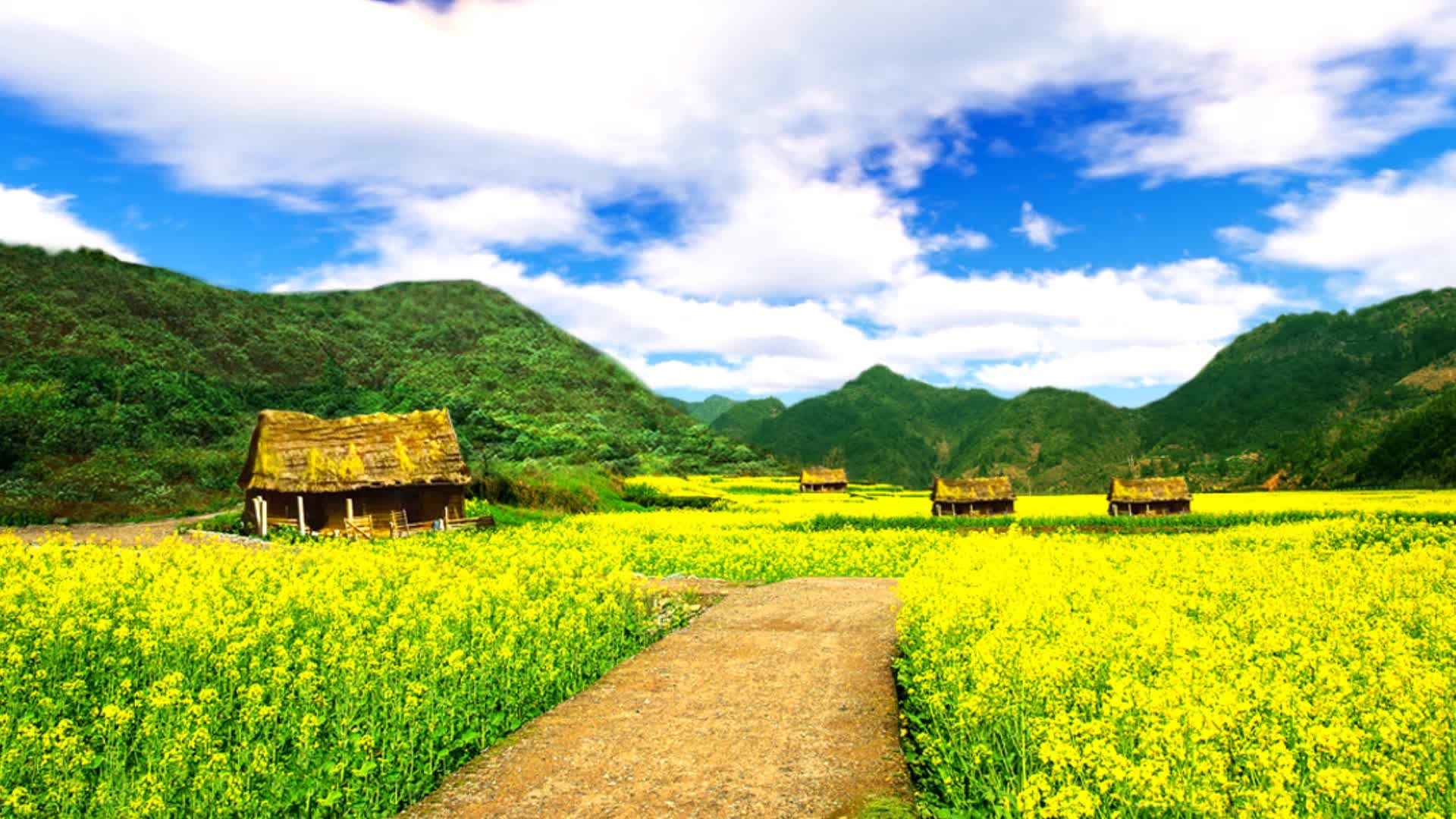 油菜花田野乡村小路 小道农村村落场景 草房茅草屋背景 古代生活场景 戏曲外景LED 小品情景剧舞台剧话剧 武侠游戏大屏