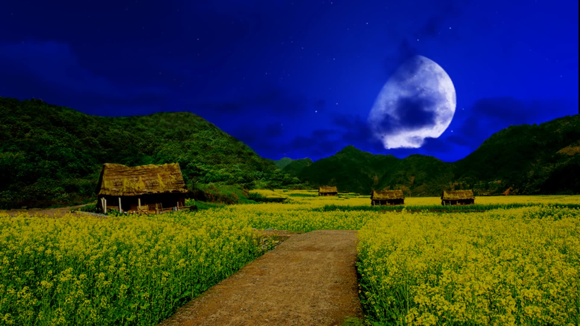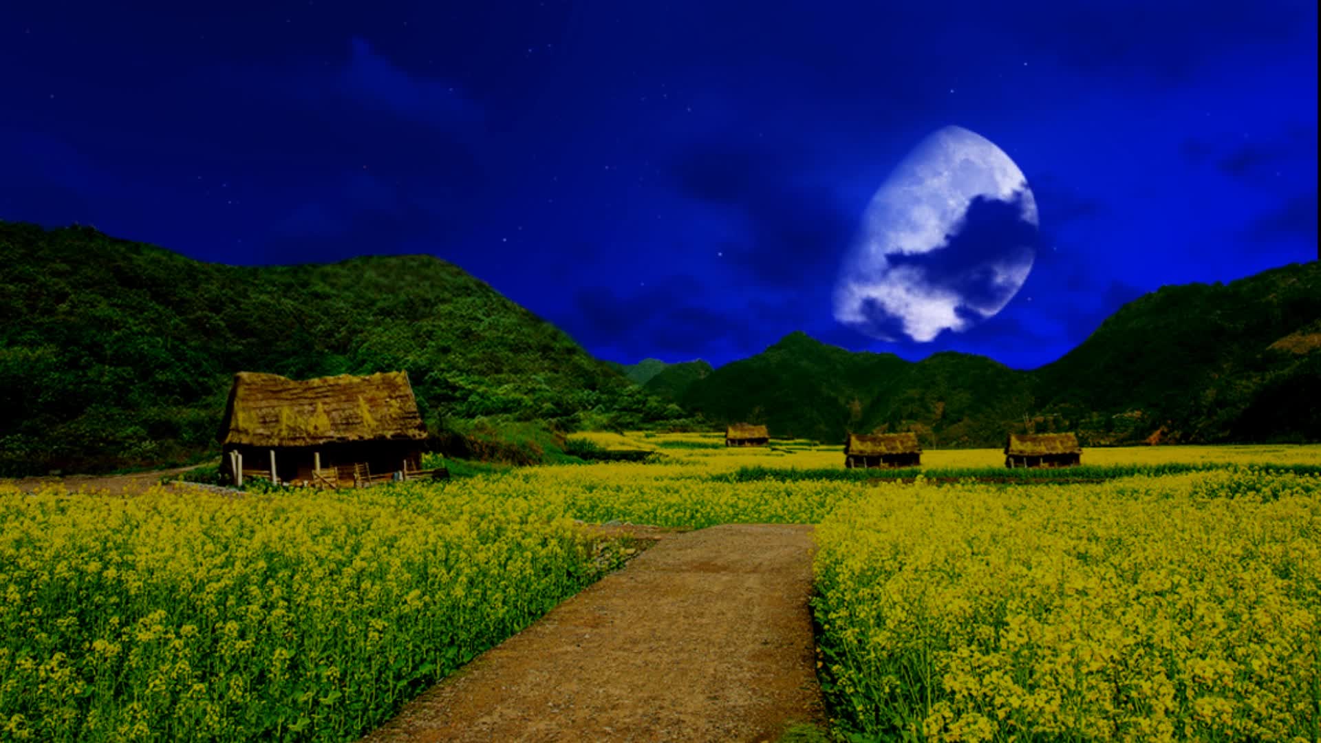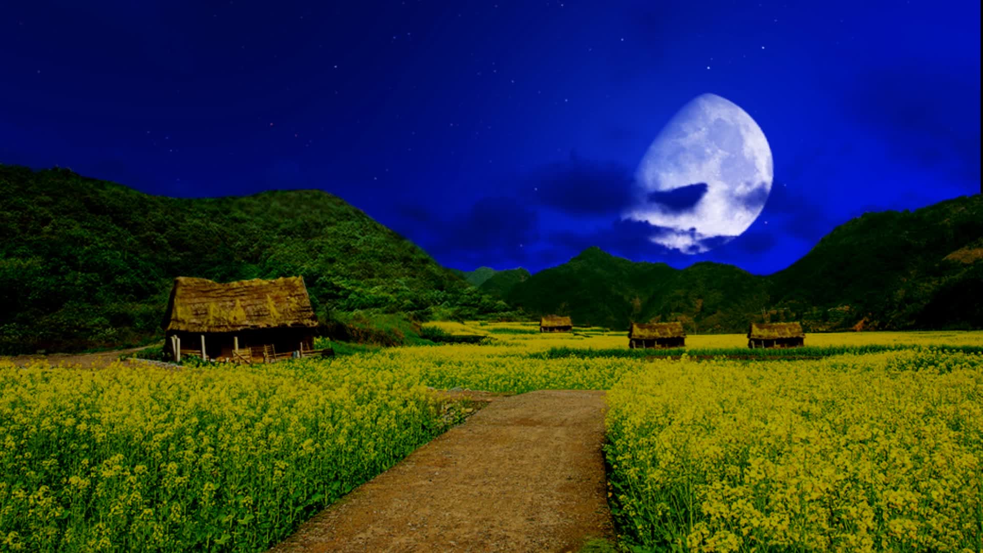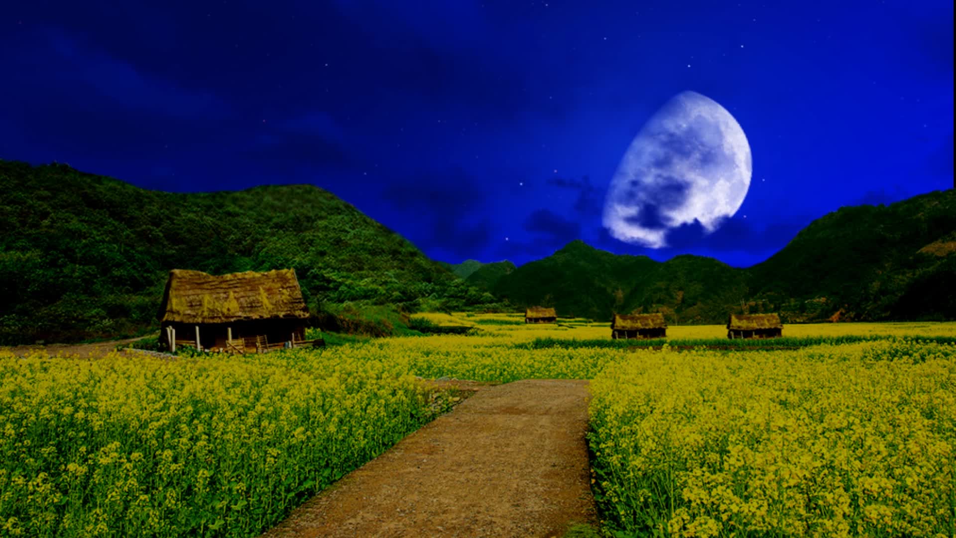 油菜花田野乡村小路 小道农村村落场景 草房茅草屋背景 古代生活场景 戏曲外景LED 小品情景剧舞台剧话剧 武侠游戏大屏夜景 晚上夜色夜晚月色 月亮